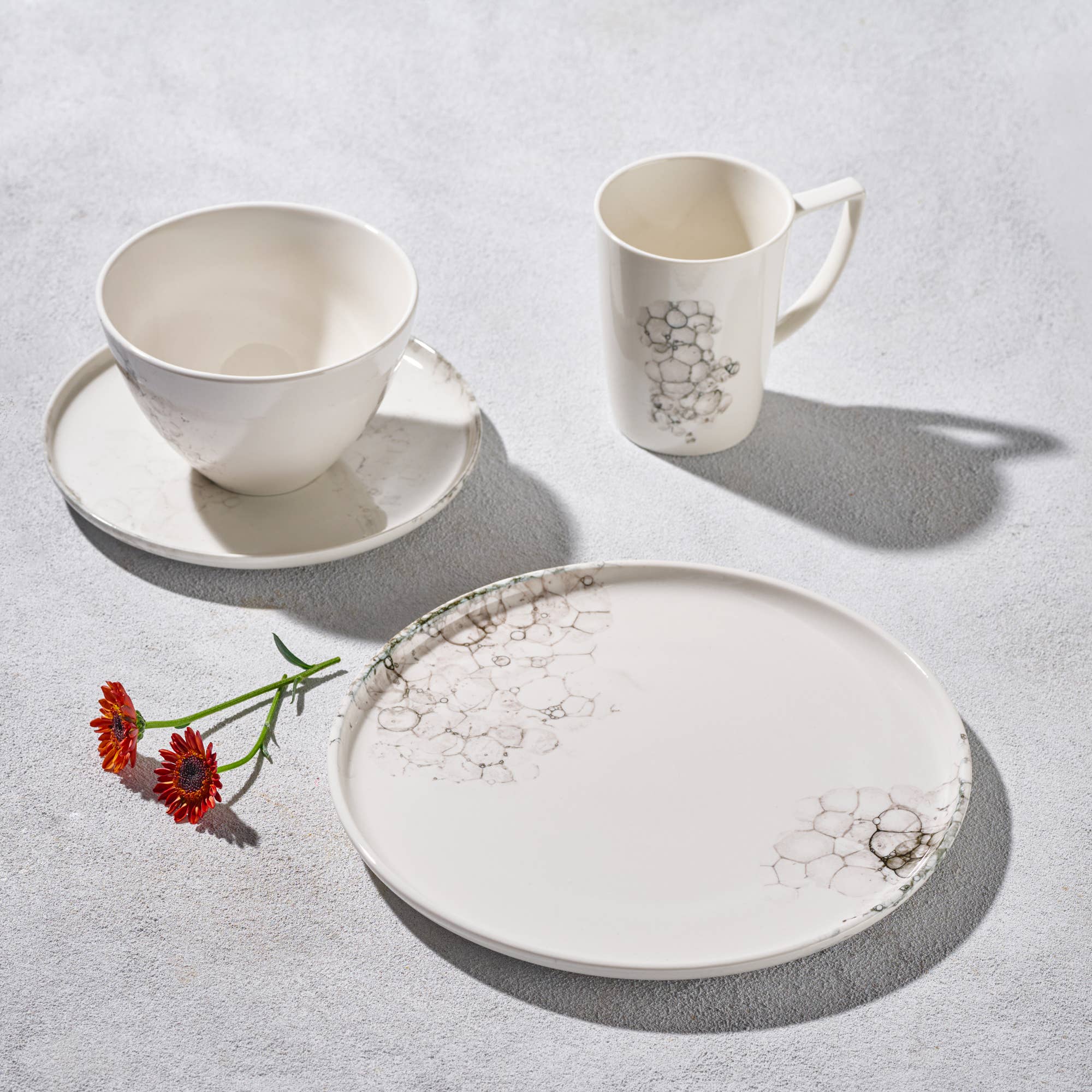 Brush aside your views on traditional fine white bone china. Pick a plate pattern that is exquisite and ocean-inspired, whimsical and worthy of modern day dining. Features: Handcrafted from fine white bone china All pieces are dishwasher and microwave safe. Why KOKEN? Design + Premium Quality Fine Bone China Our porcelain stands out for its color, transparency, lightness, and durability. Ultra-white, super lightweight, high resistance 16-piece collection, four place settings: - Four Diameter Dinner Plates - Four Diameter Salad Plates - Four Diameter Bowls - Four Coffee/Tea Mugs Dimensions -10.4” Plate Weight: 2Lb -7.8” Plate Weight: 0.