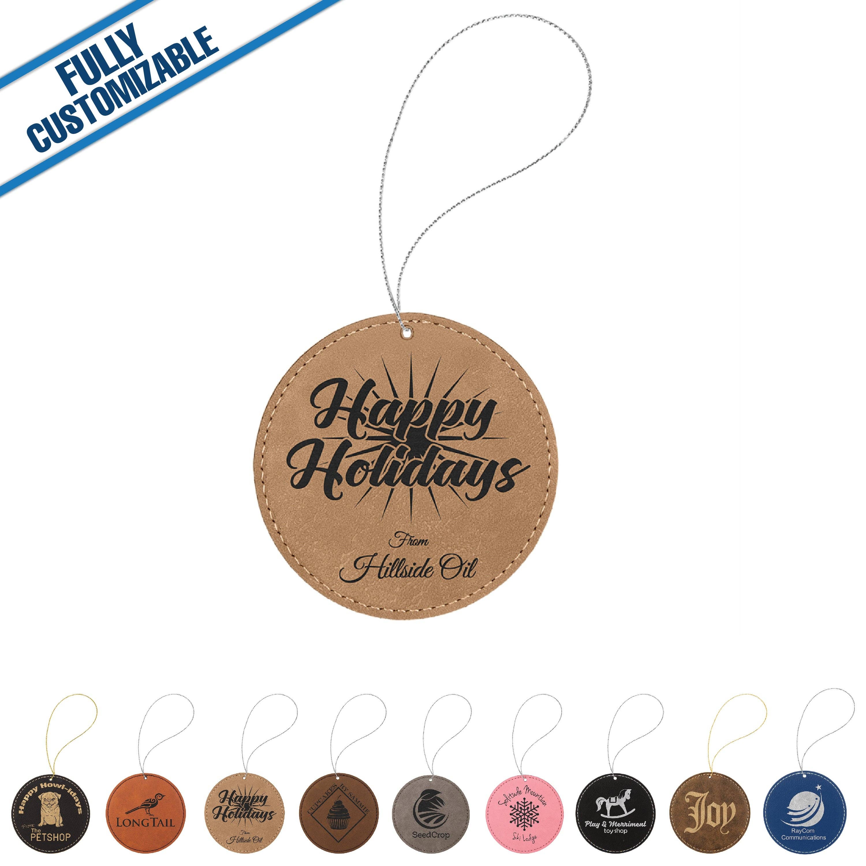 The design is fully customizable. Please provide your contact information (Name, phone#, & email). Please explain what you would like for your design (including text). If you have usable images to provide please note that you will be emailing images separately. Please email them to orders@giftworksplus.com. Please note that you will receive design proofs that will need to be approved before production of the order. Leatherette ornaments are sure to impress. Customize them ornament with your favorite design and spruce up for the holiday season. Whether hanging in a tree or anywhere else, they are sure to impress. Leatherette provides the look and feel of genuine leather. Durable enough for daily use with water resistance, rich texture, and the ability to clean easily. NO set-up fees! NO design fees! Free personalization! 1 piece minimum! Leathette Engraved Includes attached string Double sided Use matching designs or a different design on each side