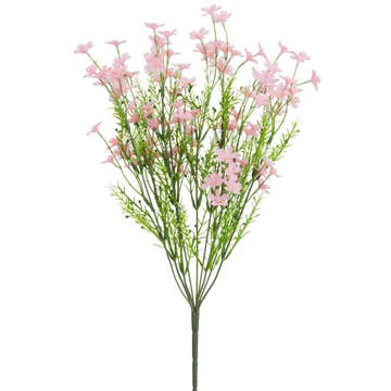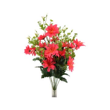 Bring a touch of color to your floral displays with this Artificial Cosmo Daisy Bush. Its leaves accented with cheerful flowers, make it a great addition to floral arrangements, wreaths, and other decorative displays. Size: 11" H (from the bottom of the stem to the top of the tallest branch) Blooms 2 inches diameter Case Quantity: 12 individual bushes Material: Polysilk flowers and leaves - coated wire stems Container not included Place this bush in a container for an instant flower. Separate the sections adding them to other florals. Whether you're enhancing arrangements or designing decor, this artificial bush is an inexpensive go-to for crafters, florists, and decorators alike!