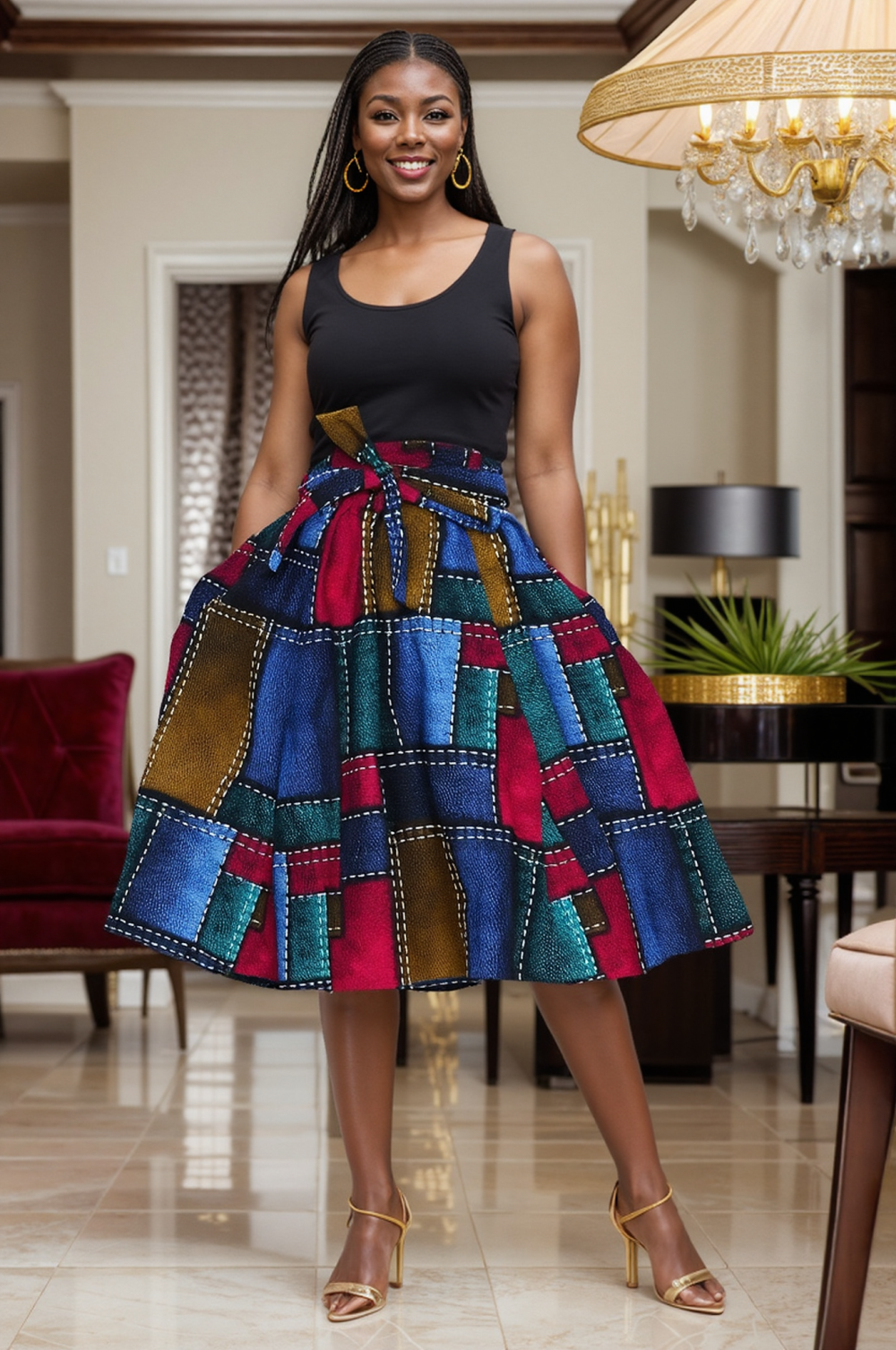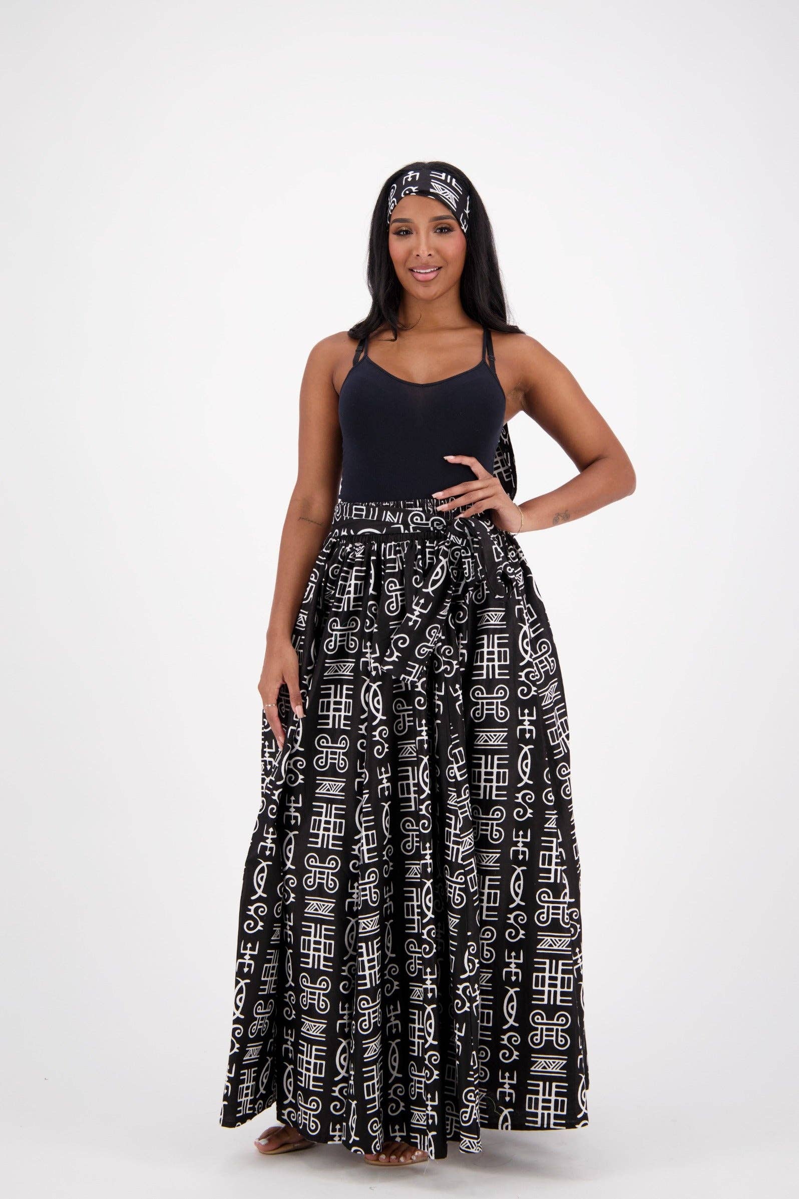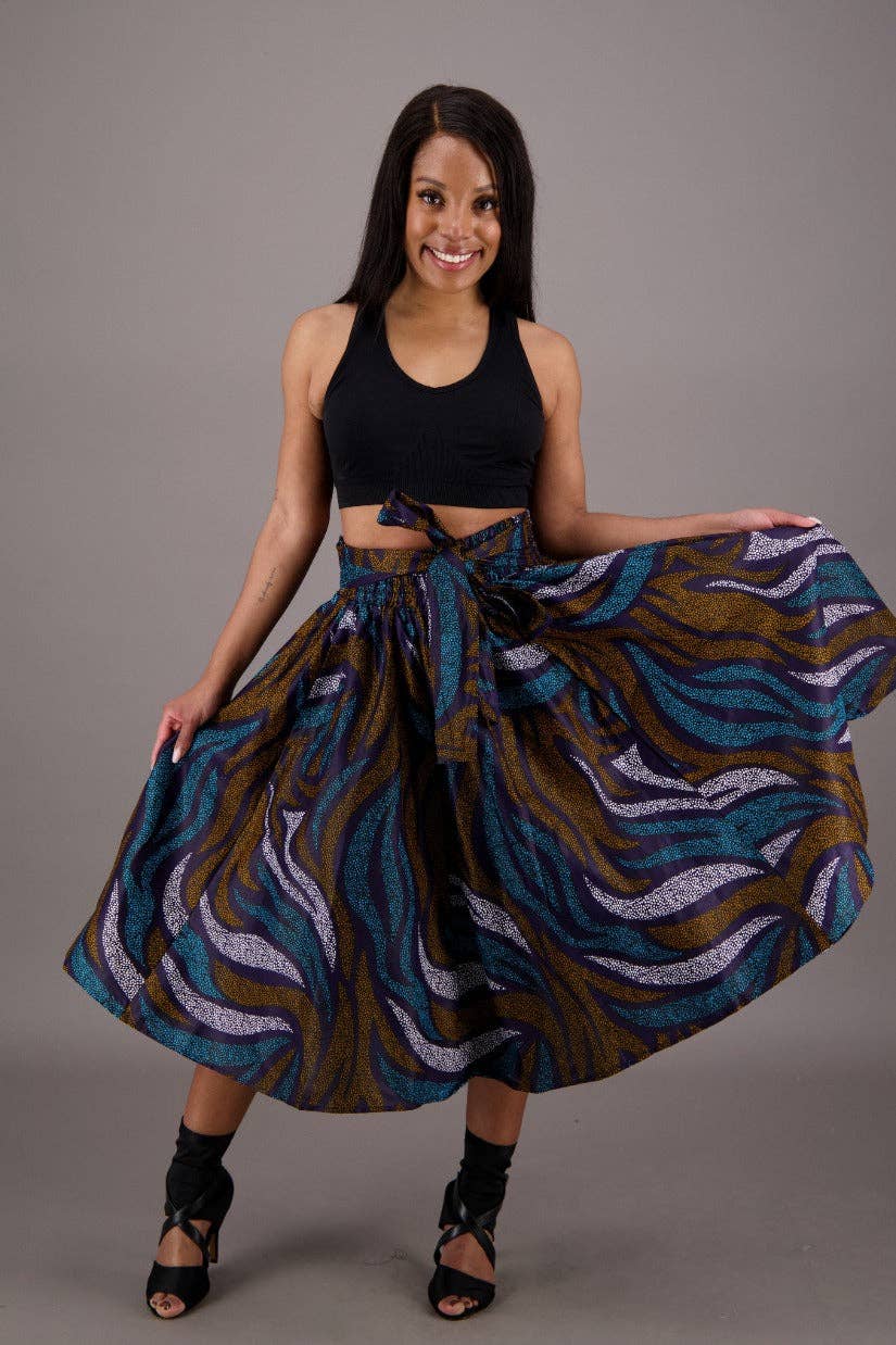 Advance Apparels 42 inch full-length, tie-waist skirt in a vibrant three-hue African wax print. Includes matching scarf for versatile wear. This Ankara Print maxi skirt is perfect for a capsule wardrobe because of it's ability to be worn for several occasions ranging from church, holiday party, or for a formal dinner. * One Size Fits Most * Made-In-India * 100% Wax Print Cotton * Facemask Included * Two side seam pockets<