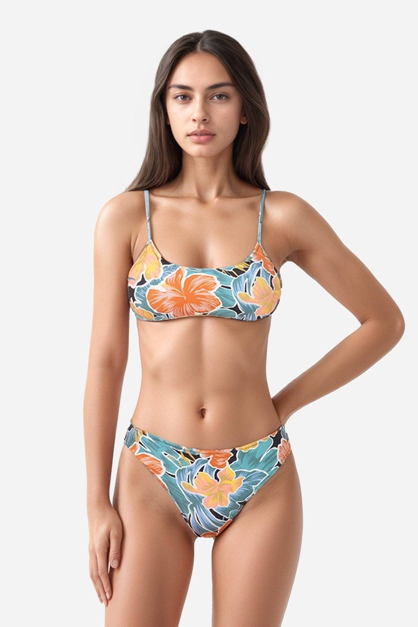 This bikini give is hella sexy with just the right amount of coverage. slip on a simple black skirt or some shorts and you can go from beach to restaurant! 86% Polyester & 14% Spandex Chlorine-resistant fabric. Bikini Top: - Keyhole Halter style. - Adjustable back strap. Bikini bottom: - High waisted. - Modest coverage. All swimwear comes with hygienic liners. Matching Flip Flop: https://www.faire.com/product/p_vt2asdzr2v Additional Description: swim summer sunbathe sunny top bottom water beach beachwear ganja green relax high weed nugs green punk high lit blaze two-piece, tank, modest hawaiian flowers tropical terps
