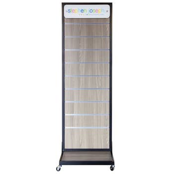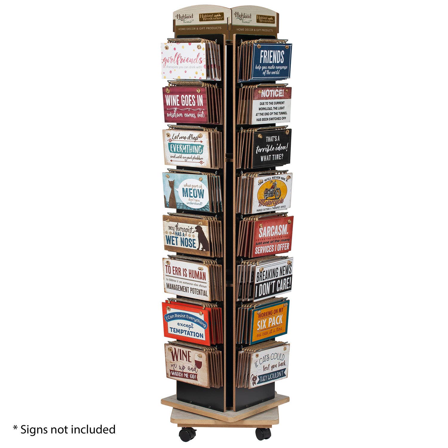 This brand new spinner rack has 3 levels of 4 totalling 12 pockets! Each pocket will hold up to 15 signs showcasing up to 180 signs! The metal rack stands above 5 arms with coasters that allow for easy placement and stocking. Standing at 67" Tall and 23" diameter, this rack takes up very little space and can easily be moved. The casters have 2 locking wheels to ensure the rack does not move. It also comes equiped with a sign holder on the top for advertising the signs.