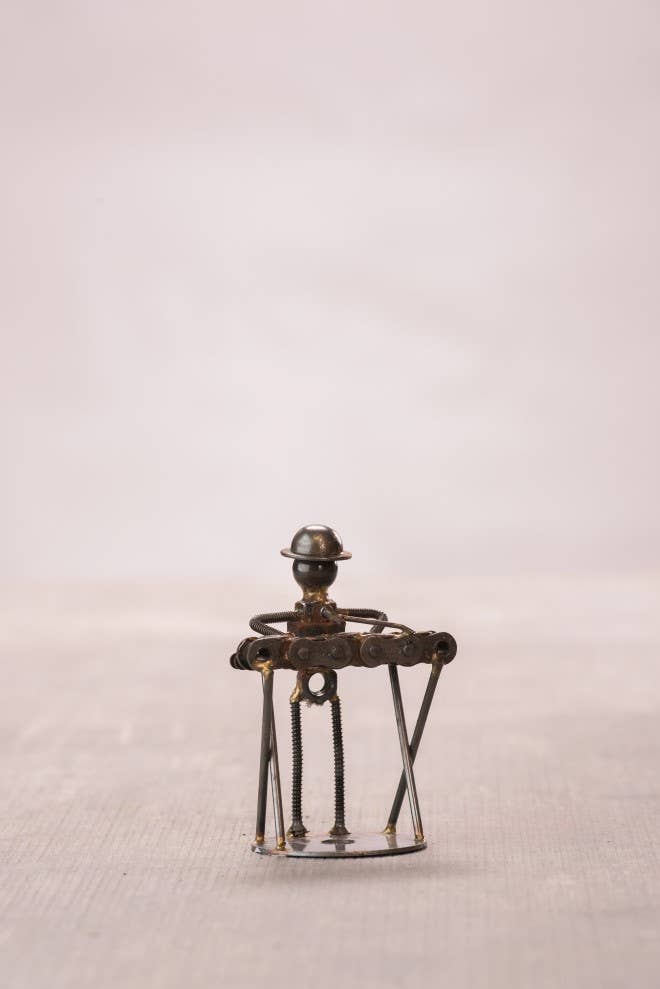This is a handmade scrap metal dog. The canine is crafted from nuts, bolts, washers, chain, and wire all welded together. This is the perfect paperweight for your desk or the perfect gift for the dog owner. This is pretty heavy and it is metal. The sharp edges have all been cleaned up and the pooch is sprayed with a clear polyurethane finish to help protect against rust.