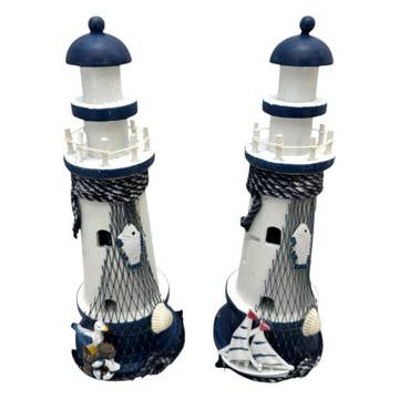 Bring coastal charm and soft ambient light to home décor displays with this Wavy Ceramic Lighthouse Tabletop Décor & Votive Holder. Designed with an open, wavy ceramic structure, this lighthouse accent can be styled as a decorative tabletop piece or used as a votive holder for a tea light or small LED candle. A discreet opening at the back allows light to glow from within, creating a warm and inviting atmosphere perfect for nautical, coastal, beach house, and cottage-inspired spaces. Finished in a rustic blue tone, this ceramic lighthouse adds texture and visual interest to shelves, mantels, side tables, or entryway décor. Why retailers love it: • Nautical lighthouse décor with coastal appeal • Open ceramic design allows soft light to shine through • Functions as décor or votive holder • Complements coastal, beach, and cottage décor styles • Easy to merchandise year-round or seasonally Measurements: 11 x 5 x 5 inches A versatile coastal décor accent that brings charm, light, and seaside style to any home décor collection.