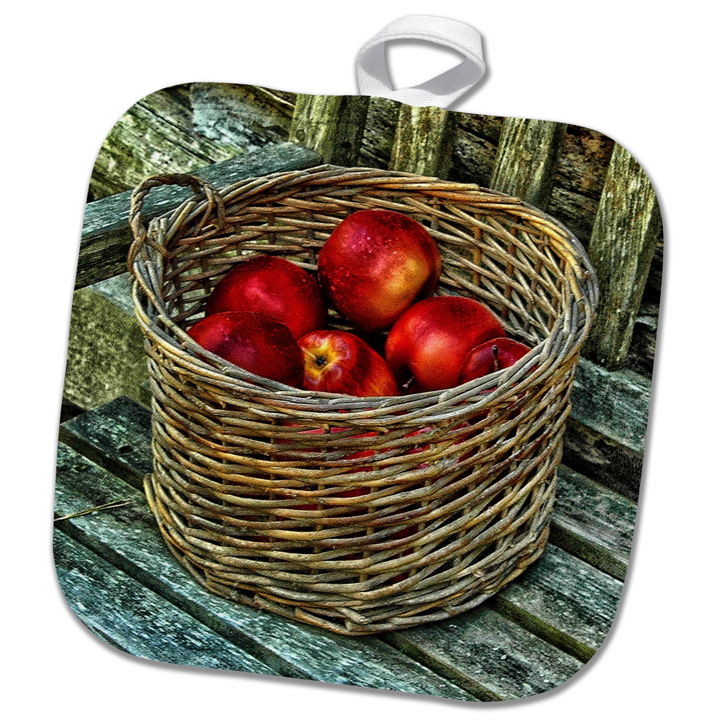 A Pair of Pot Holders to match your kitchen decor. Made in the USA these are thick and functional. Full color artwork decorates the front polyester fabric of the hot pad and accented by a black trim. Use these at as a trivet for your Thanksgiving or Christmas tablescape. Filled with insulated fabric and quilted for durability. These colorful pot holders will make a great gift for your favorite home cook or executive chef. Each pot holder measures approximately 7 1/2 inches by 7 1/2 inches. A hanging tab is included.