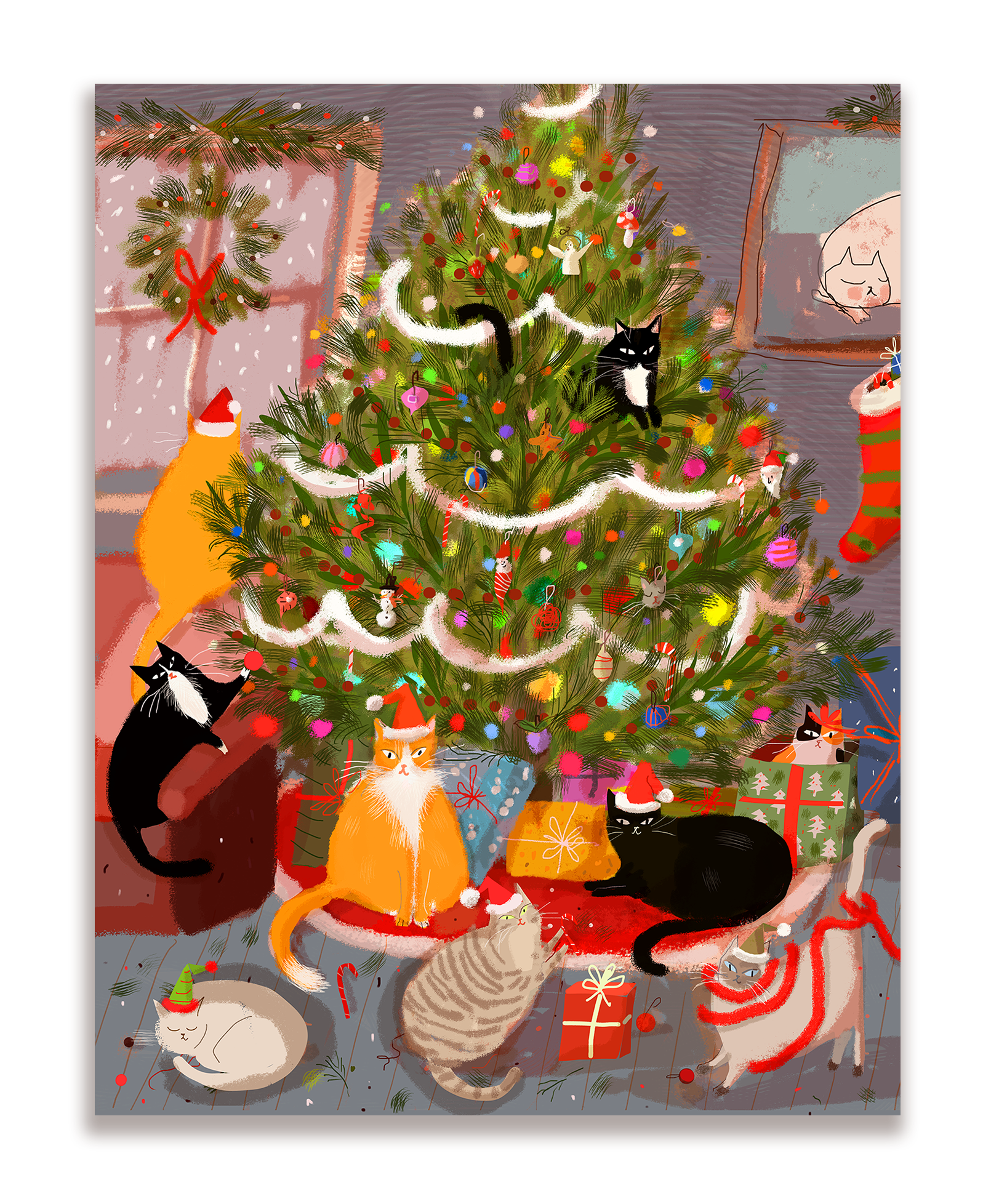 Experience '12 Nights of Christmas' with 12 playful cats in festive feline flair, accompanied by a charming poem. The ultimate funny Christmas card for cat enthusiasts. Get the 12-card pack for a purr-fect holiday treat. -The illustration spans from the front to the back of the card. -A2 size (4.25" x 5.5"), blank inside -Luxury heavyweight eco-friendly paper -Single card & envelope in clear cello bag or plastic-free packaging -Handmade in Berkeley, California, USA -Resellers welcome to use product images