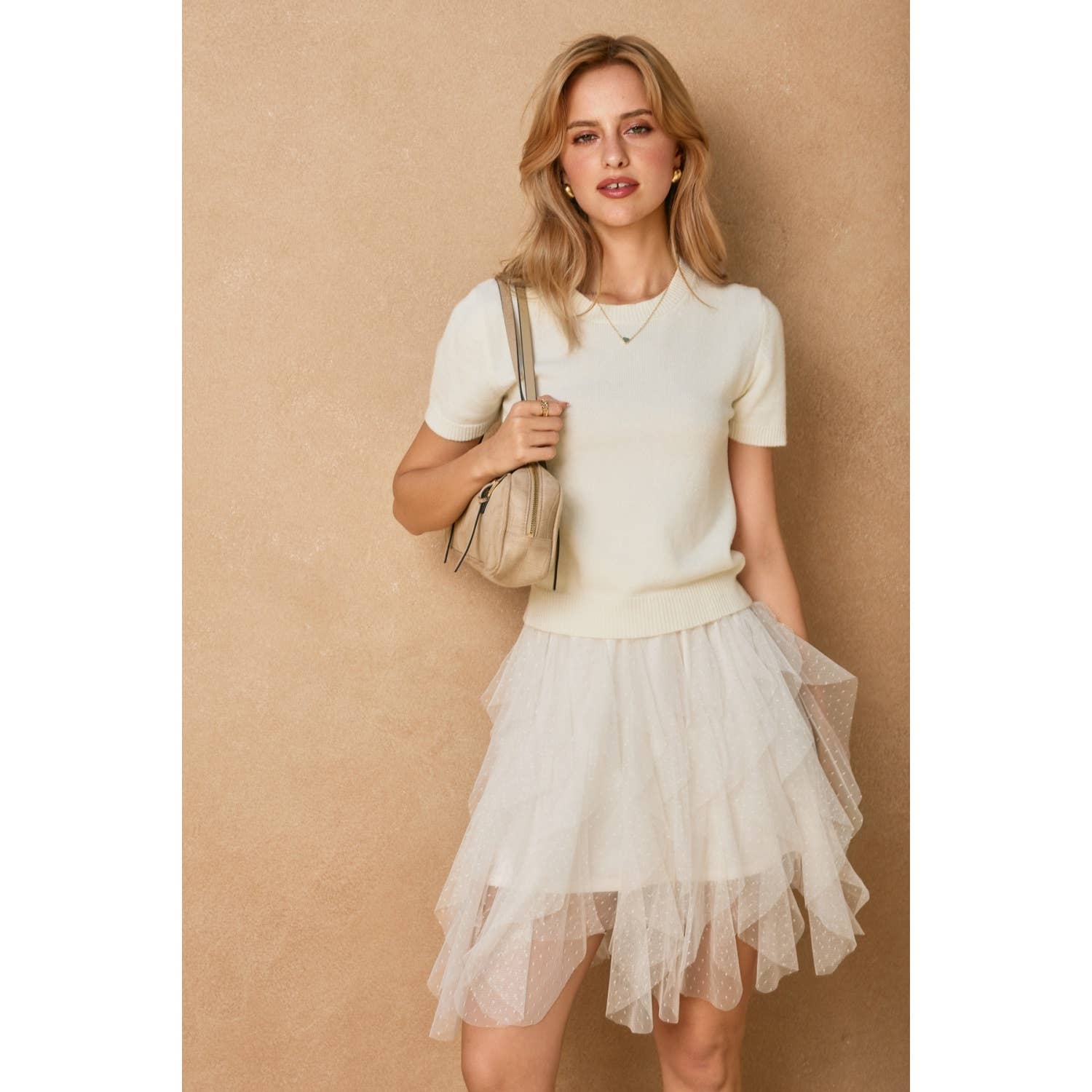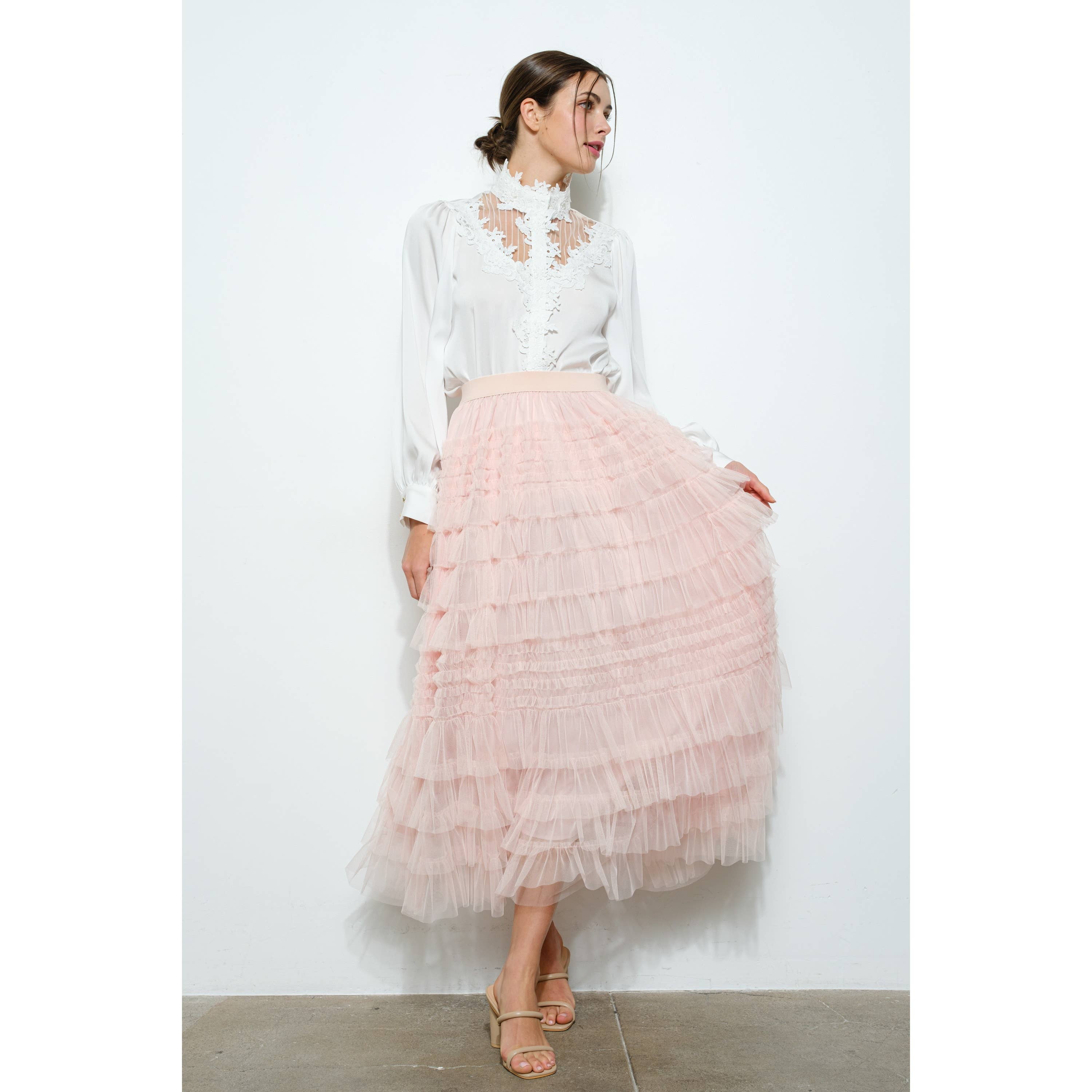 Features: * Dreamy pink tulle skirt featuring a delicate sheer, see-through overlay and a soft blush underlayer. Materials & Care: * Care: Hand wash only Sizing: * Joanna is is 5'7", wearing a size S