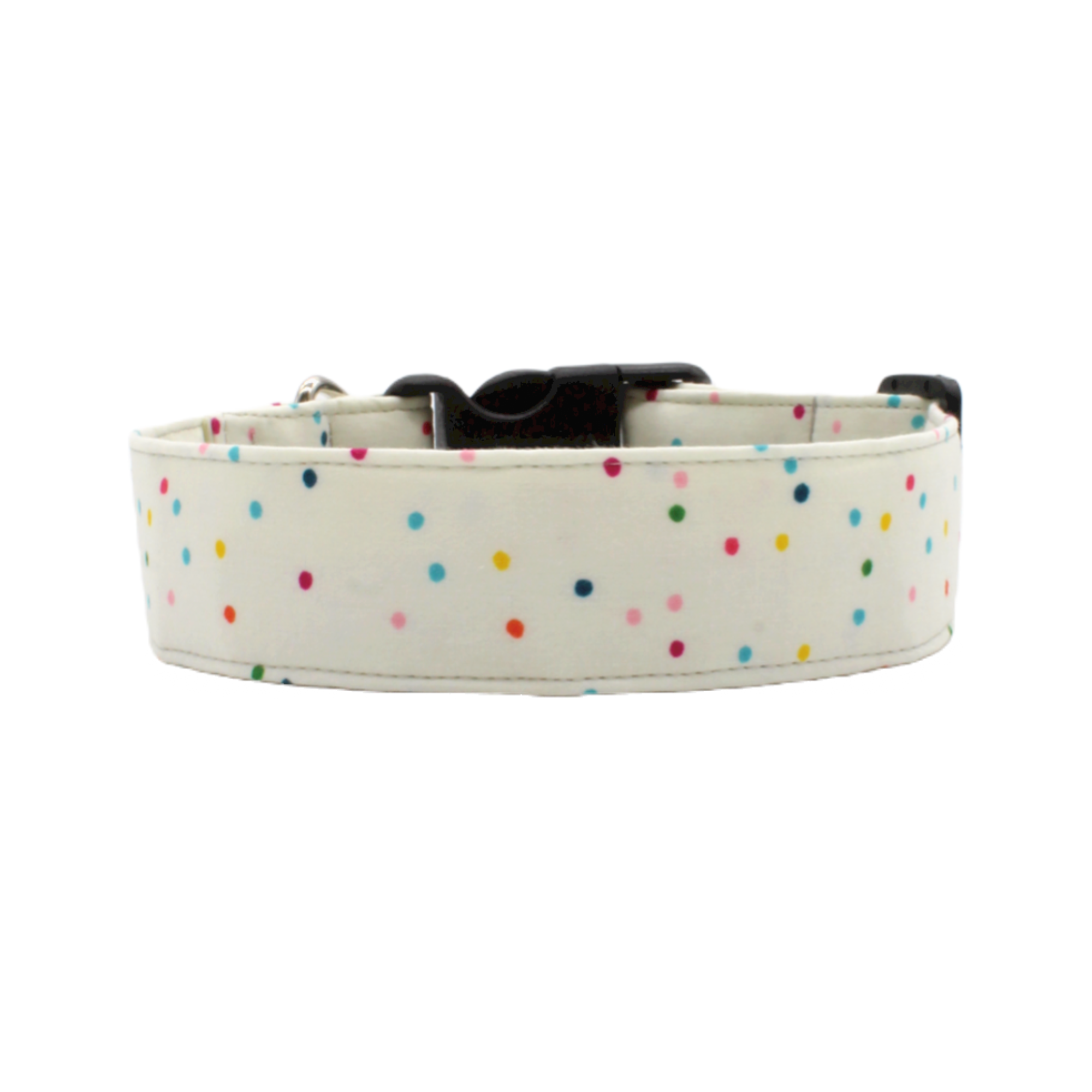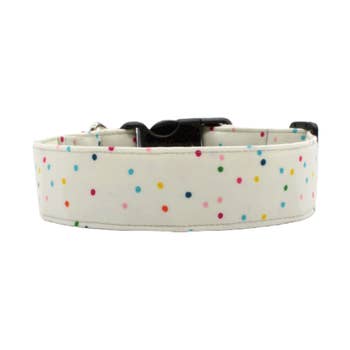 The Ebony Dot dog collar is a sophisticated and fun combination of jet black fabric with white polka dots dancing across the collar. This dog collar is the perfect fit for any stylish, trendy pup. These collars are made with designer fabrics and your choice of either a traditional black plastic buckle or our signature SP metal buckle. The nylon webbing core has a tensile strength of 2100 lbs., so they can withstand pulling by even the strongest of dogs. Our collars are machine washable.