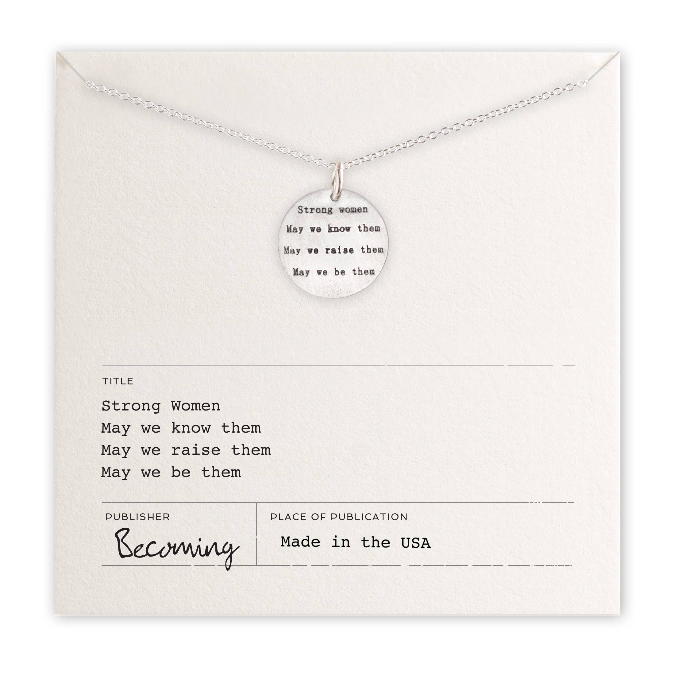 “I am not afraid. I was born to do this.” This empowering quote is attributed to Joan of Arc, and is stamped on a pendant in either sterling silver or 14kt gold vermeil. This necklace makes a great gift for graduations, to mark a new endeavor, or even Mother’s Day. A little boost for the strong and brave ladies in your life prepared to take charge of their own destiny. Each pendant measures 1/8" x 1" (25mm). Designed by Christine Street of Chocolate and Steel and handcrafted in the USA.