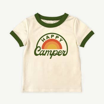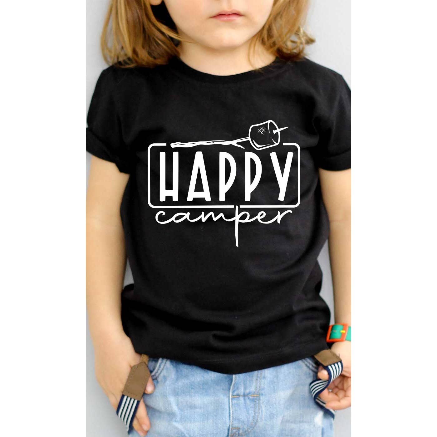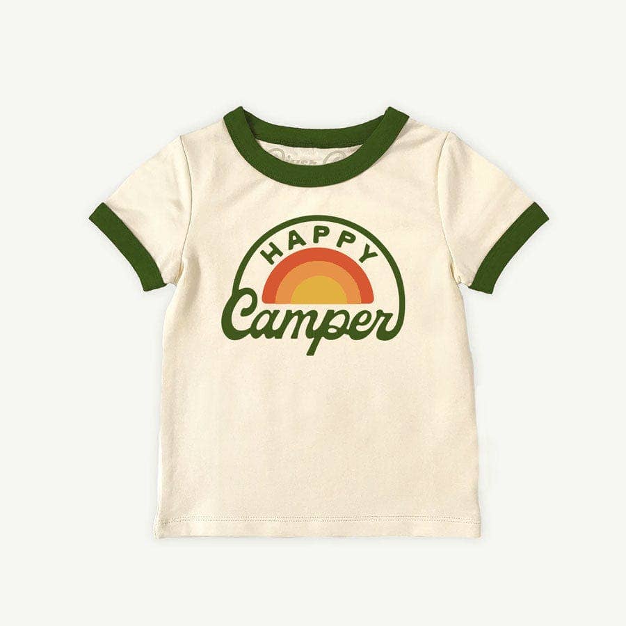 Our happy camper design on a 100% cotton rabbit skins toddler shirt.