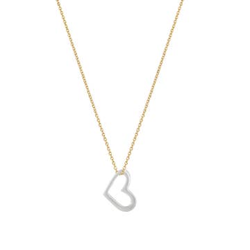 The necklace is made with sterling silver hearts on gold Rolo chain. Heart rotates to be worn in different directions: upright, on its side, or upside down. Chain and components are base metal. The heart is just shy of 1/2" wide and 1/2" tall.