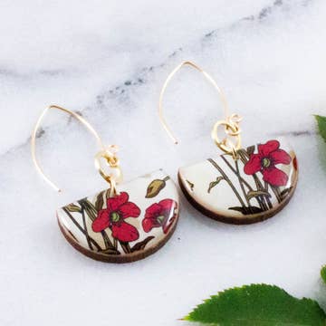 Clear photo earrings handmade with acrylic, resin and a photograph of colourful botanicals. 1-1/4" tall, 1/8" thick. Sterling silver ear wires. These earrings are clear so whatever is behind the earrings will be the background of the image, making them quite subtle from certain angles. There is an additional photo of similar earrings being worn as well as a photo of the earrings as they come, packaged.