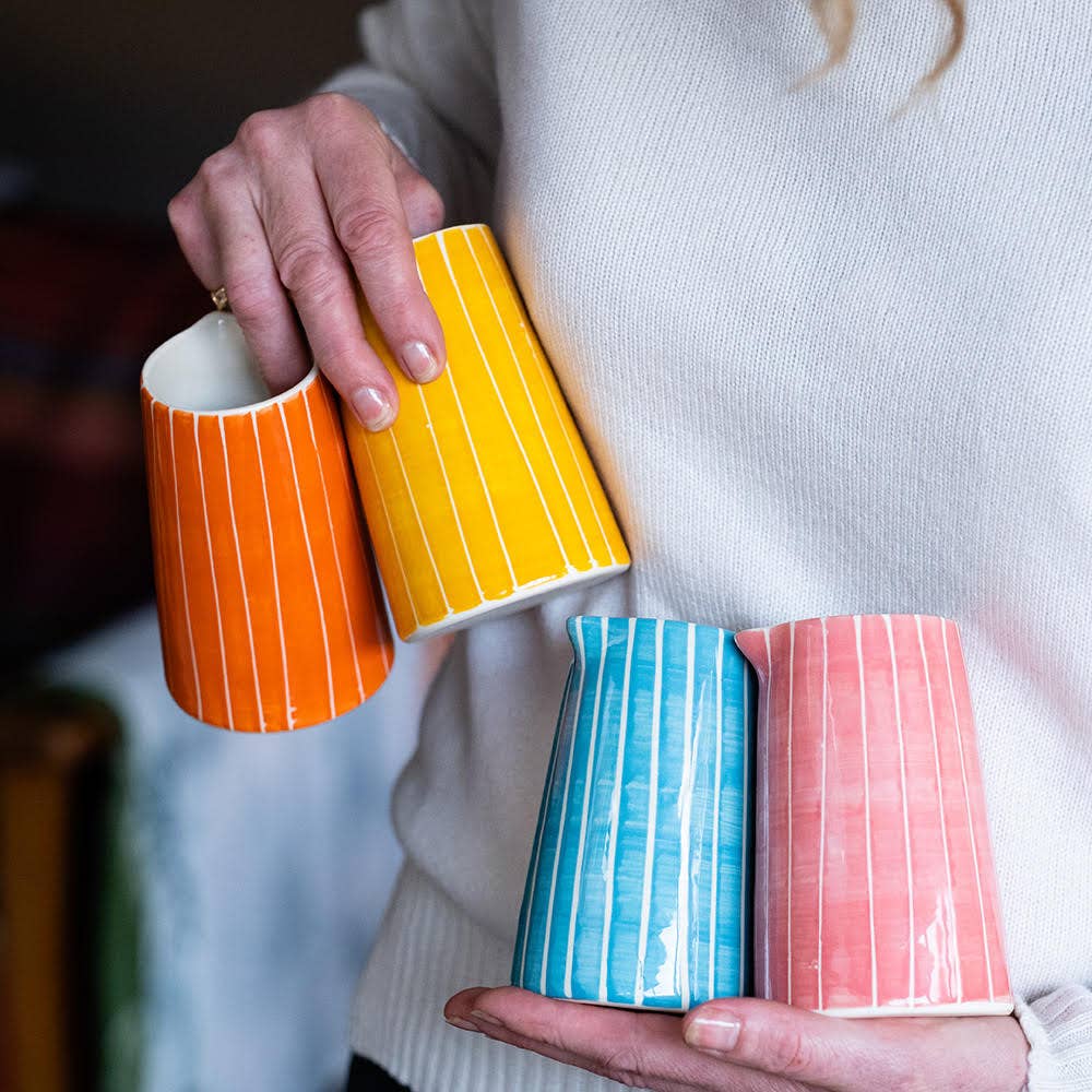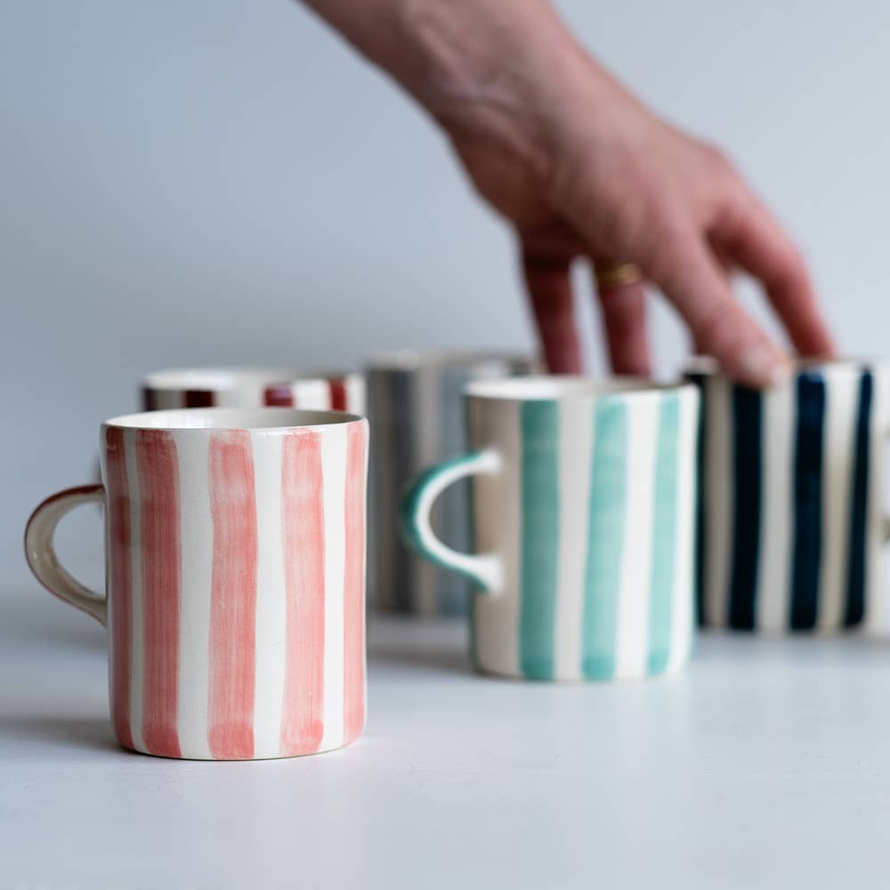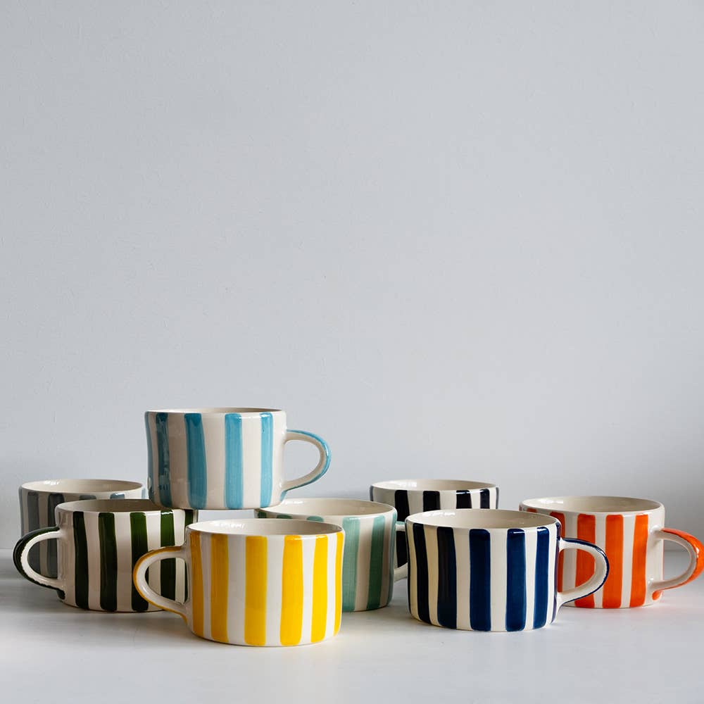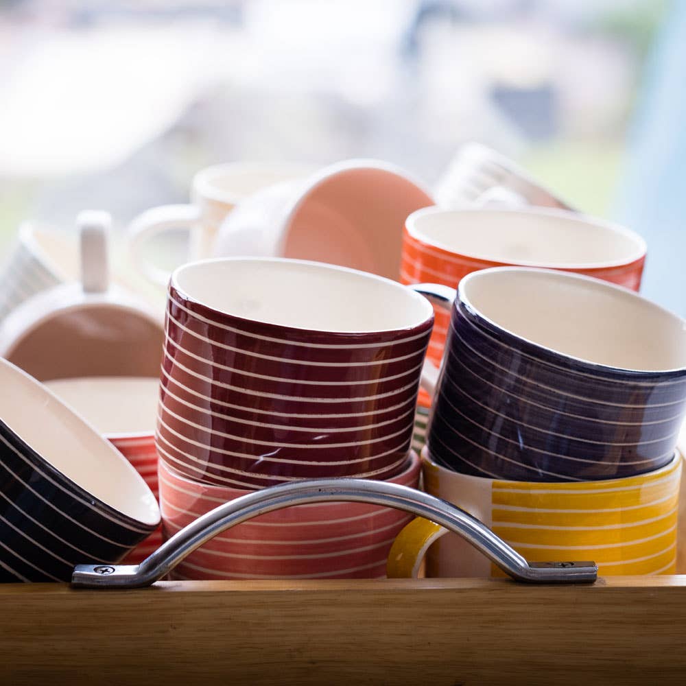 Discover the Contemporary Handmade Coffee Mugs Sgraffito Stripe by Musango, a family-run business based in Herefordshire, United Kingdom. Our mugs, along with our expanded range of jugs, casual dining offerings, stationery, and kitchen linen, reflect our commitment to high-quality, stylish, and functional design. With a contemporary design and attention to detail, these mugs are more than just drinkware, they're a vibrant addition to your kitchen. We offer a range of 15 bold and bright hues to choose from, ensuring there's a Musango product for every taste. Thank you for choosing Musango.
