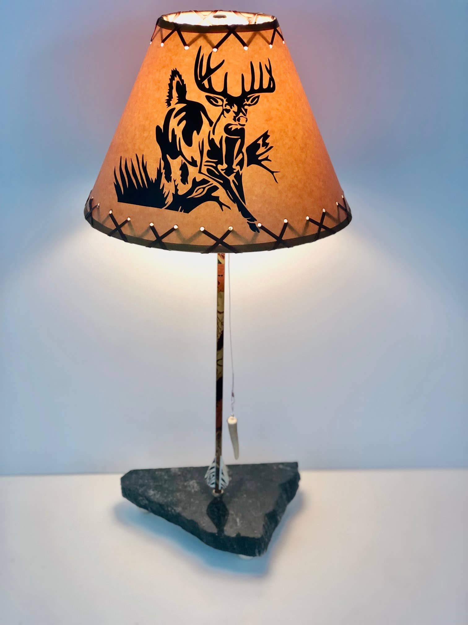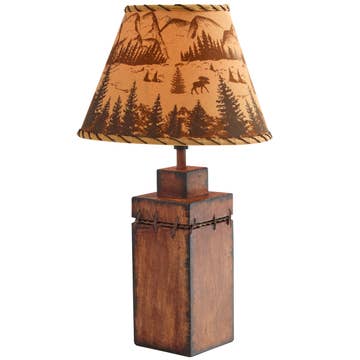 This awesome table lamp features the majestic 12-point buck standing on a rock outcropping, with a tree acting as the lamp base. Measuring 20 inches tall, including the profile deer bust printed, 12 3/4 inch diameter shade, the lamp is a wonderful decorative accent for nature lovers. This lamp is UL-approved and It uses one Type A light bulb up to 45 watts, which is not included.