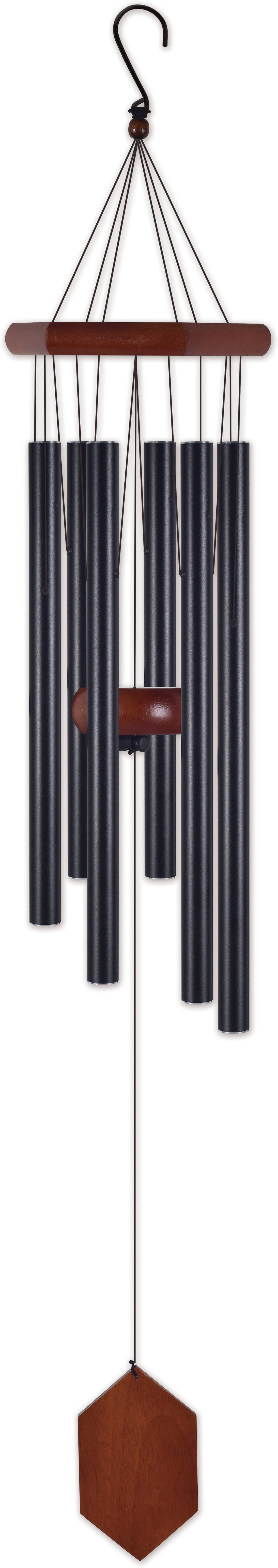 Aestheticism with functionality, the Peaceful wind chime from Sunset Vista Designs exudes a classical style in beauty and in tone. Handcrafted with anodized aluminum tubes, solid wood & durable nylon braided cord. Six, deep bronze harmonizing tubes balance below the solid wood octagonal suspension platform. Each gentle breeze produces a blended tenor tone. The solid wood sail is blank so it can be personalized. Made with rust-resistant, anodized aluminum, wood & durable nylon braided cord. Each tube provides a joyful resonating note. Includes easy hanging metal hook. Makes a great gift for any season or reason!" Measures approximately: 5.5" x 5.5" x 42"
