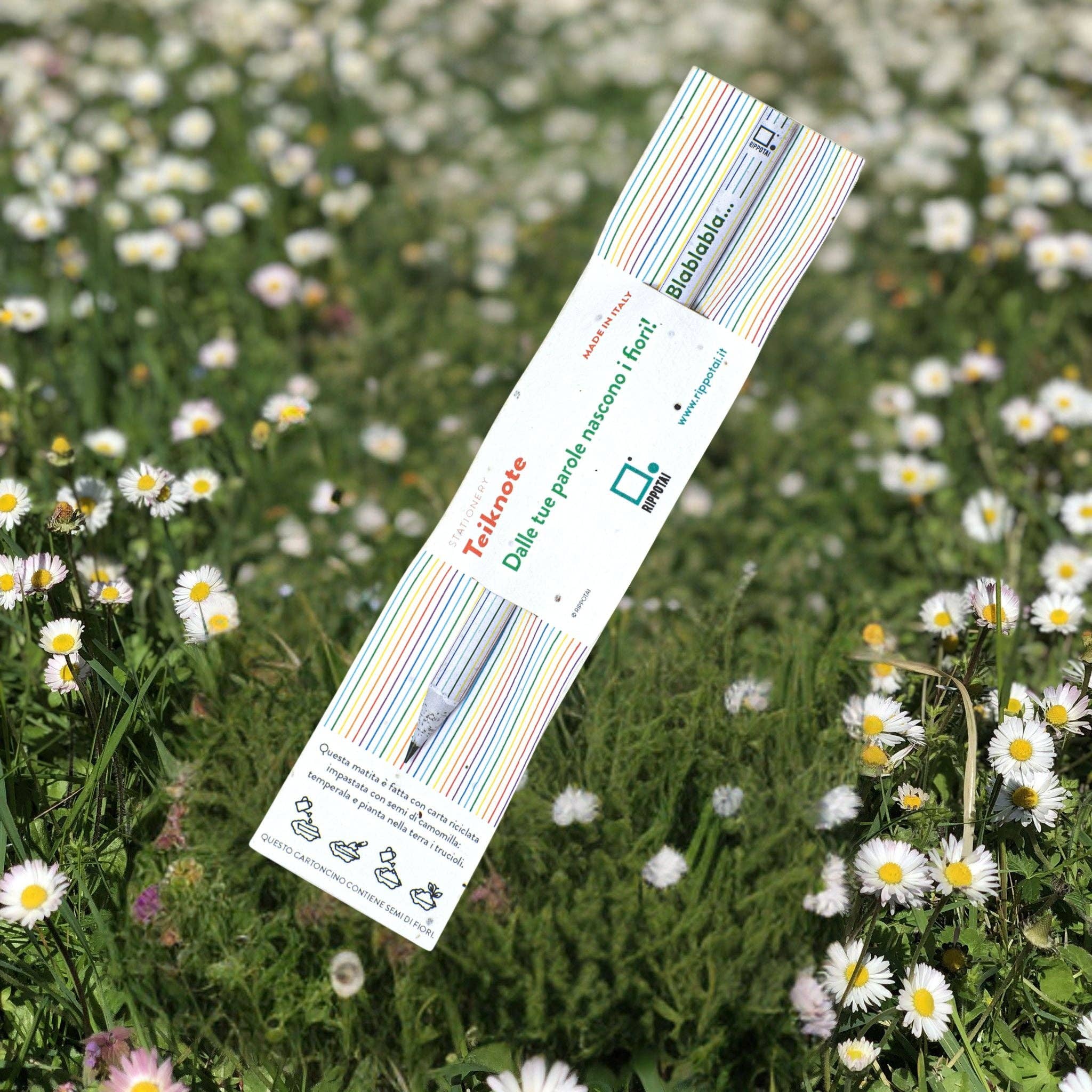 Write, temper and plant! Plantable pencils are always part of the Teiknote line and are composed of recycled newspaper mixed with chamomile flower seeds. Every time the pencil is sharpened, the shavings can be planted: from the words the flowers are born. The plantable pencil is inserted inside an original blister also made of plantable paper containing mixed flower seeds much loved by bees and butterflies. You can use the blister as a bookmark and when you decide not to use it anymore, just wet it abundantly and put it in a jar with a little soil. Cover everything with more soil and get wet.