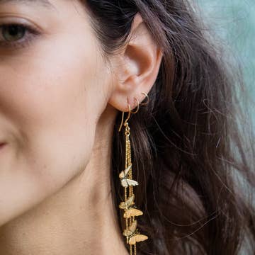 These delicate earrings are incredibly soft to the touch. Gold-plated chains peek out between the feathers to add texture and sparkle. Earwires are gold-plated. Length ranges from 5" to 6" total. Coque feathers are from unique roosters that grow these exceptionally long feathers and shed them once a year. These birds have been bred for over 100 years by fly fishermen, who use the feathers as fishing lures. Sustainably sourced in the USA.