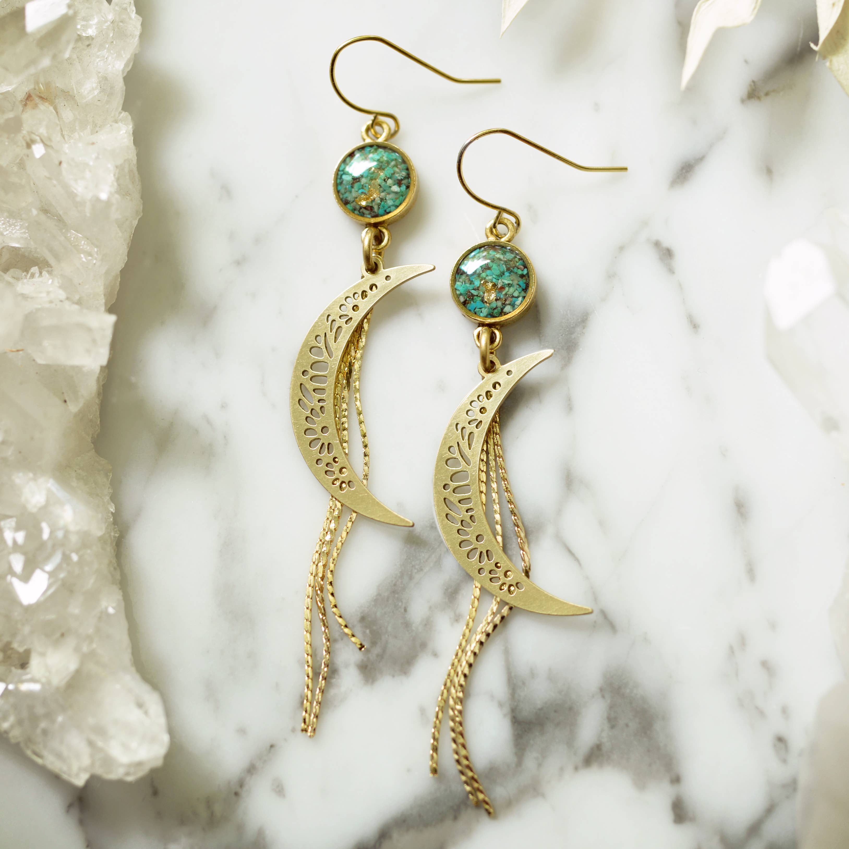 Step into light with our Gold Rainbow Arch Chain Dusters. These ethereal earrings symbolize expansion, flow, and new beginnings—like walking through a shimmering doorway of possibility. Lightweight with luminous movement, they’re a radiant nod to hope and transformation. * 14k gold fill hooks * Chrysocolla pendants * 4.5" long and lightweight * Wrapped in Dreamers of Dreams bag