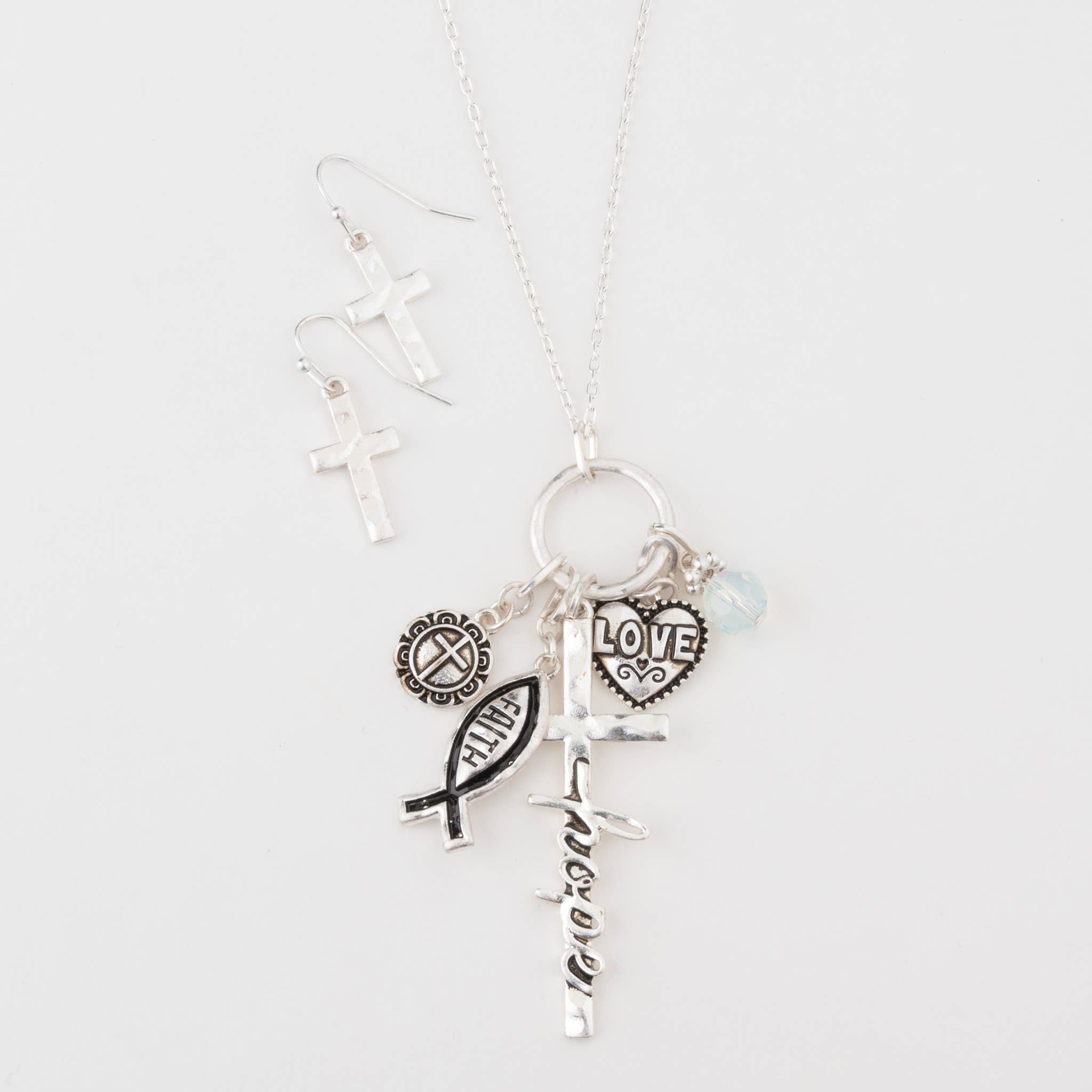 The set includes two 20" stainless steel rope chain necklaces! A great set for yourself, as a gift or to keep one and give one to someone you love! Each rope chain features a beautiful hand cast focal charm, a delicate heart and a Aurora Borealis white crystal accent. All charms are made right here in America, using Genuine 100% American Pewter.