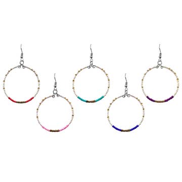 Banjara earrings prepack: 12 pairs of earrings with stones and a wooden slotted display. Handmade by artisans. Ear wires are lead and cadmium free. Earring styles may vary from picture.