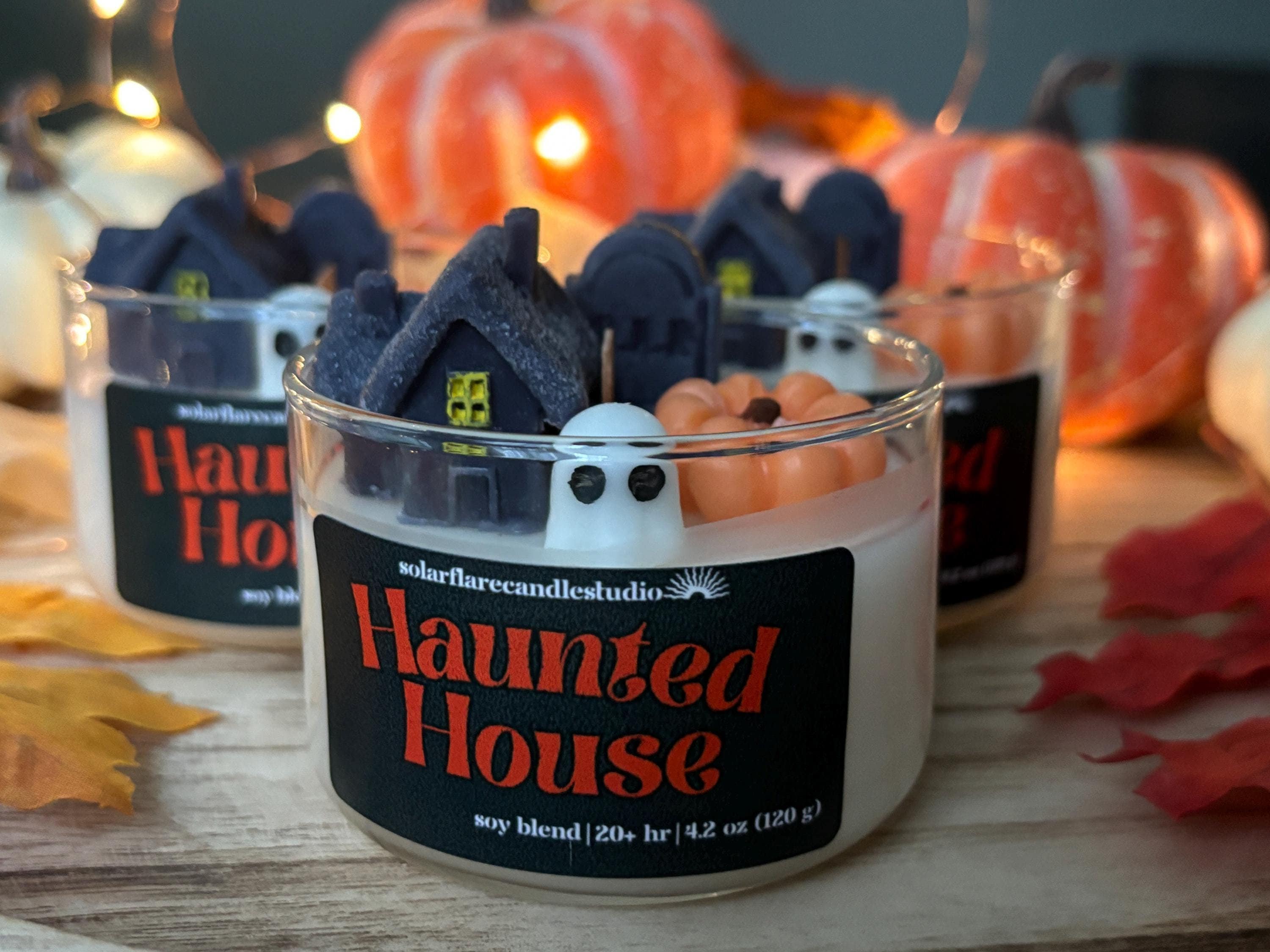 Made in United States Handmade: Handmade Number of Wicks: 3 Occasion Theme: Halloween Occasion: Halloween Season: Fall Size: 9”l x 6”w x 2-2.5”h volume is approx 20-24 fld oz. measurements do vary. Wax Type: Soy Wick Material: Wood & cotton for ghost