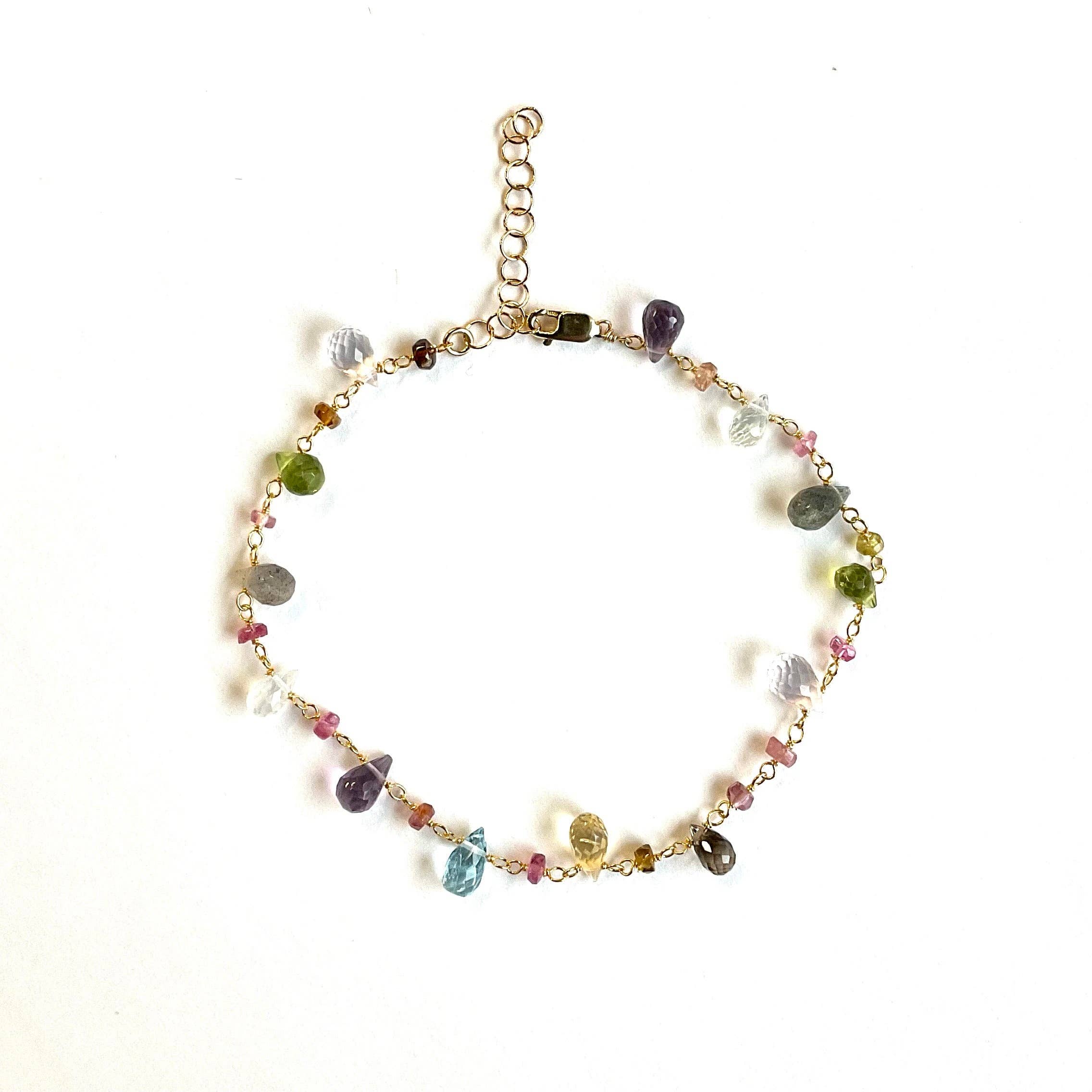 Introducing Sea Lily's 1053 - Spring Ring Bracelet with Fluorite Stones. This handmade charm/dangle bracelet features fluorite stones and industrial steel wire. Sea Lily is known for its diverse mediums like mother of pearl, resin, piano wire, silk, geode semi precious stone, porcelain beads, freshwater pearls, and lava rock. Enjoy this piece from a brand that sells to boutiques, catalogs, stores, Museums, and Symphonies all over the country.