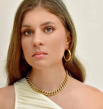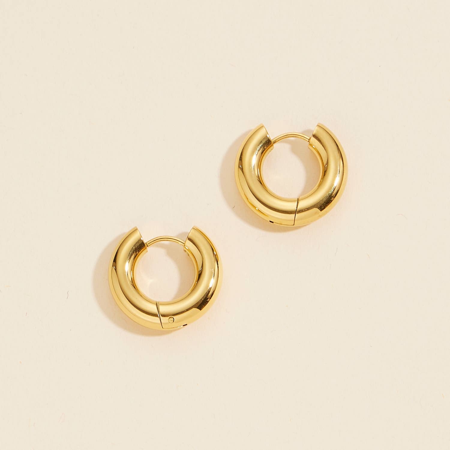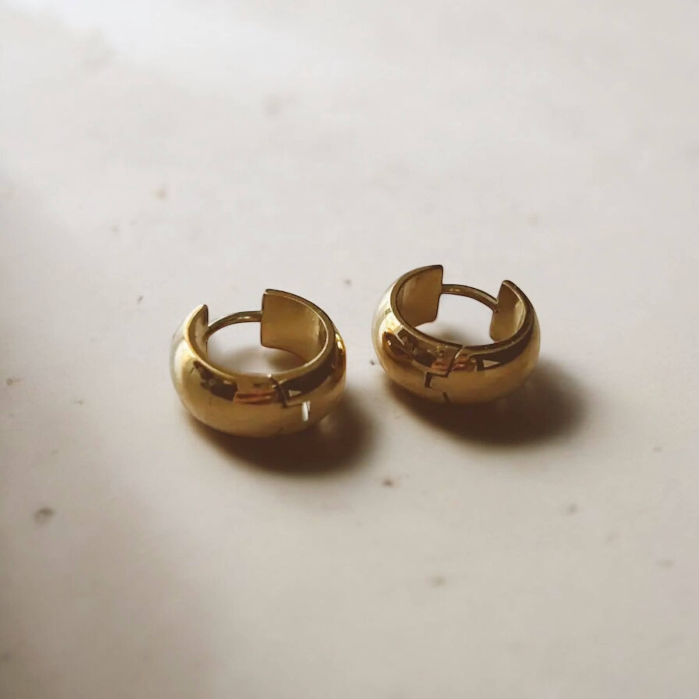 18K CHUNKY SMALL GOLD HOOP EARRINGS Materials: Stainless steel, 18K gold plated Stud Measurements: 15mm inner diameter, 22mm outer diameter, Closure: latch back Additional Info: * High polish * Hypoallergenic * Eco-friendly: We use sustainable metals and recycled gold * tarnish resistant and waterproof * 1-year warranty All of our gold jewelry is plated with recycled gold. Each piece is coated using the highest grade technique, which is made to be 8 times more durable than traditional gold-plated jewelry.