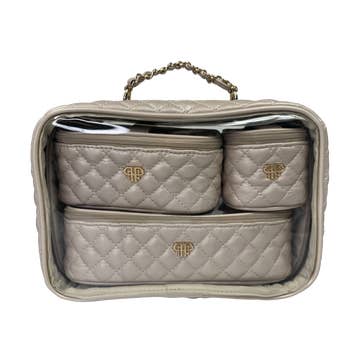 A new smaller sized cosmetic bag, in our lilac Borg check. With an internal pocket, silver zip and grosgrain zip pull. Materials - Outer: Polyester borg, Inner: Polyester