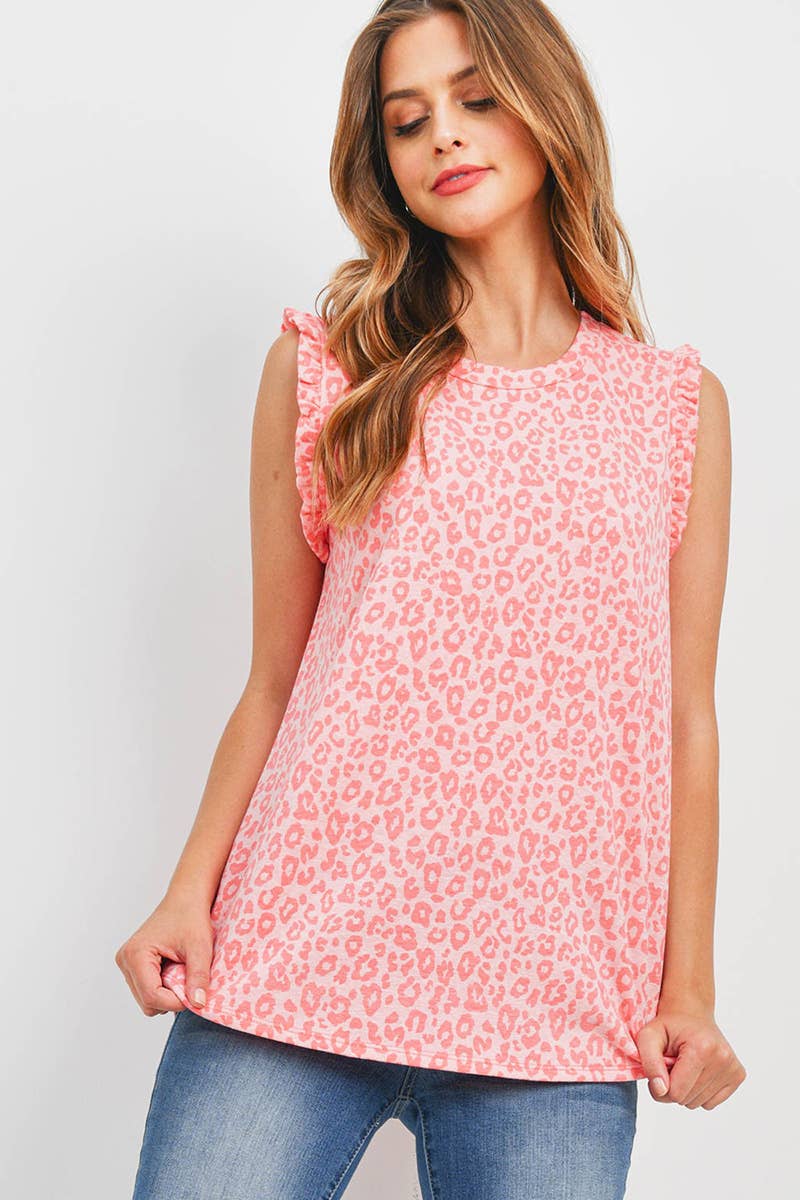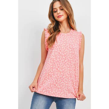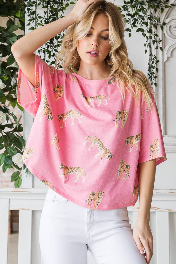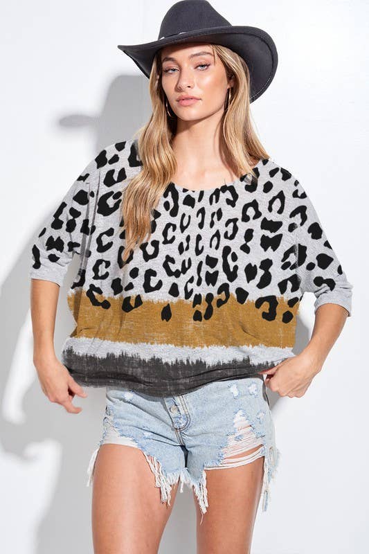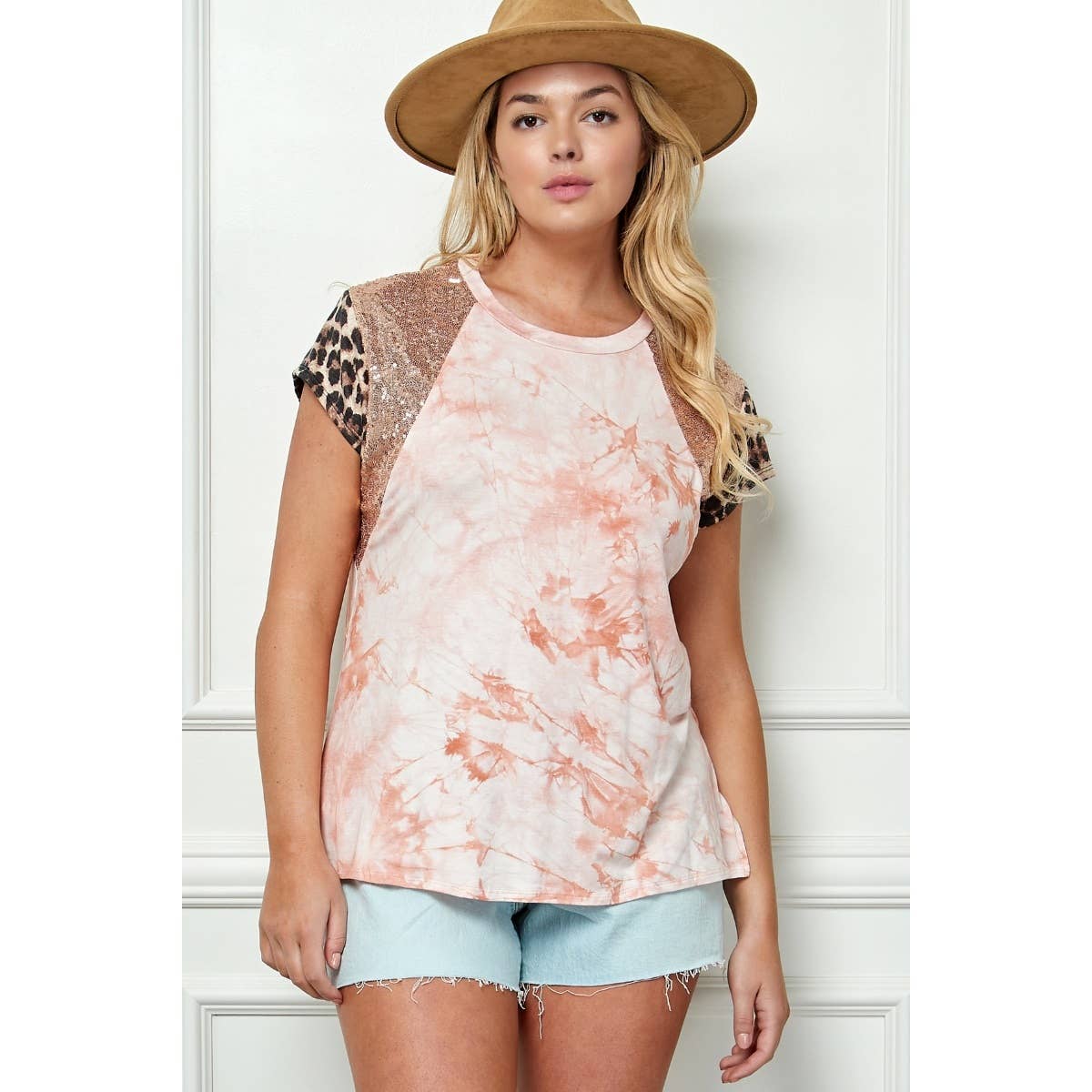 Made in USA -Relaxed fit -Round neckline -Tie dye body -Sequins shoulder detail -Animal print short sleeve Handwash Cold 96% Rayon 4% Spandex Model is 5'7" and wearing a size Small
