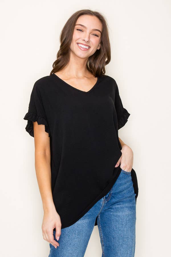 Plus size short sleeve Hi Low Hem Solid Top with Lower Back Contrast by Haute Fox. • Plus Size Women's Clothing • Plus Size Top • Available in 1X, 2X, 3X