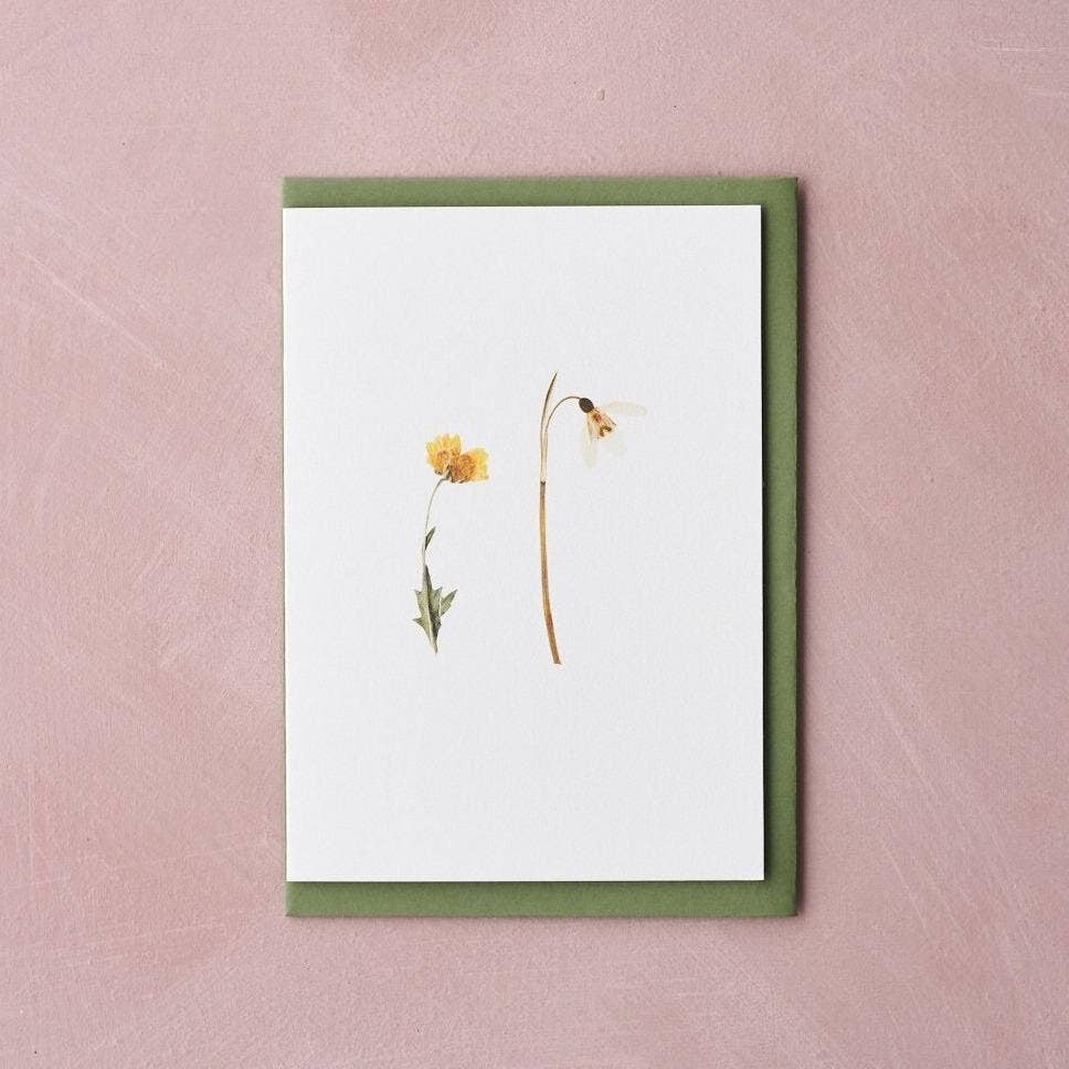 A real pressed flower artwork greetings card, made in London with real Daisy flowers; the flowers are grown and pressed for us in the Kent countryside. Size A6, blank inside Each card is unique and carefully made with a real pressed flowers so some differentiation to the photograph should be expected. The card stock is an eco range in natural colours, containing 30% post consumer recycled waste and is produced with 100% green energy. The cards have a distinctive flecked texture that pairs beautifully with the pressed flowers. The flecks are derived from adding process residues from fruits and nuts. It is an ingenious idea that replaces up to 15% of virgin tree pulp. Each card comes with a premium GF smith coloured envelope. RRP £6-8
