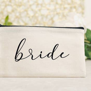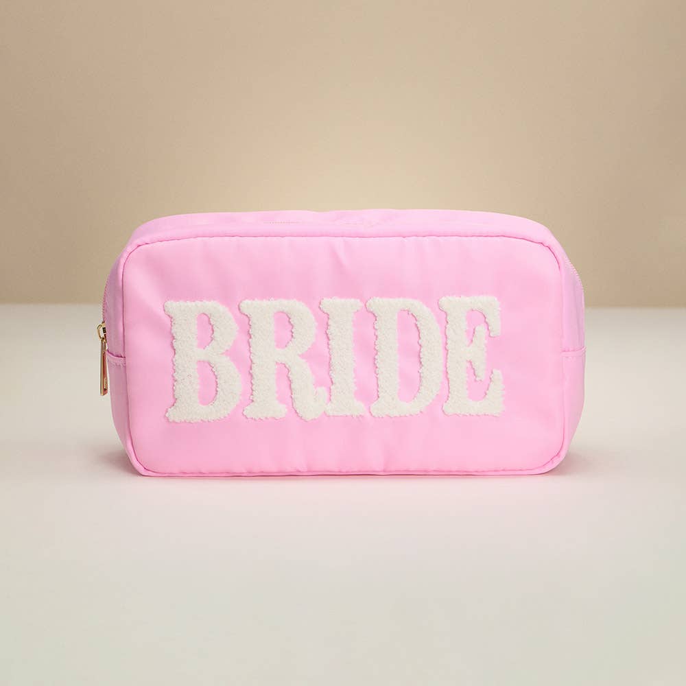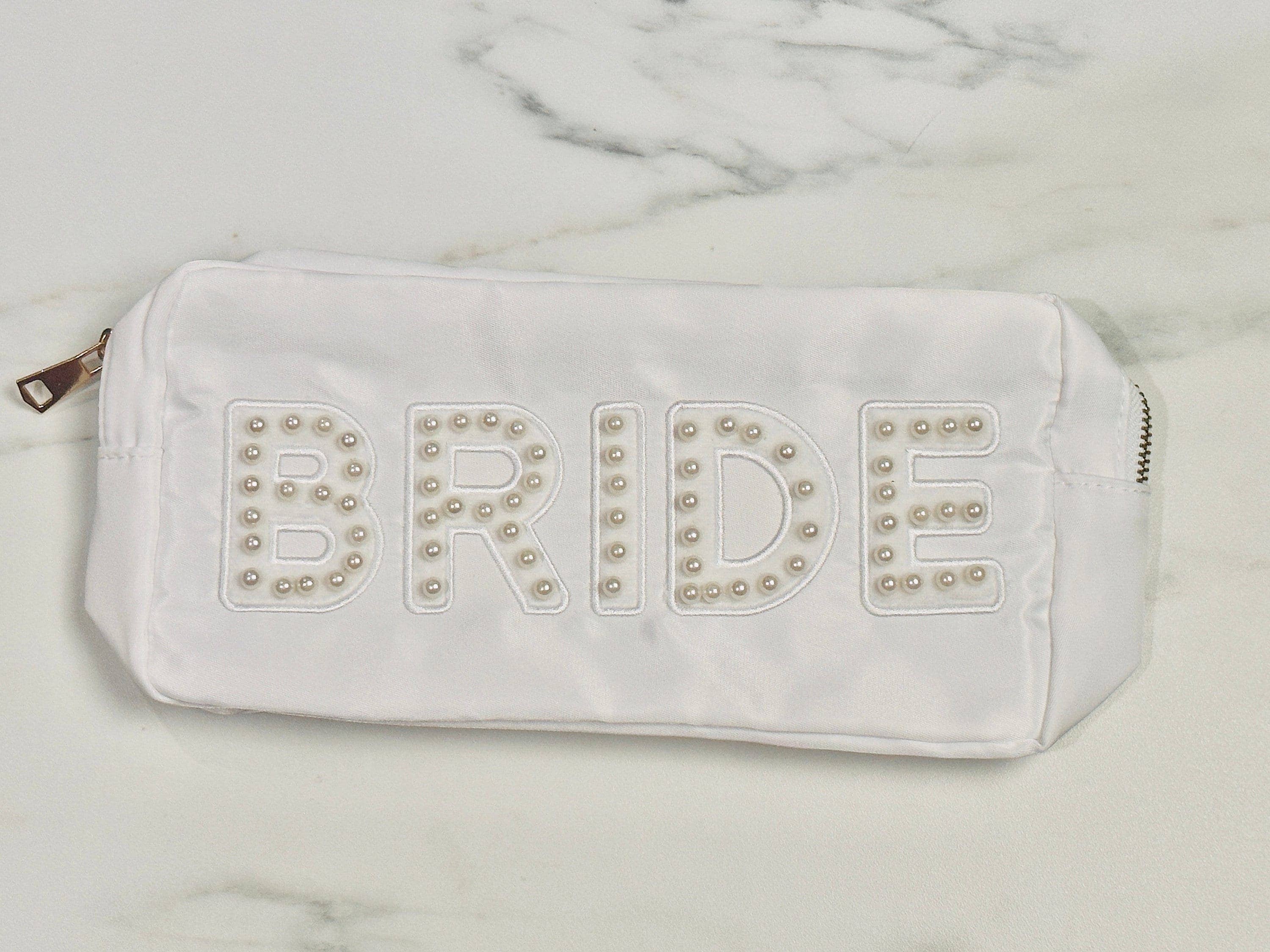 •White nylon bag with BRIDE patches sewn on •Choice of extra-large bag (measures approximately 11" X 8" X 5") or large bag (measures approximately 10" x 5" x 3") •Gold color zipper closure •Made of waterproof nylon for easy cleaning •Custom colors and sizes available, just message me Don't hesitate to contact me if you have any questions ♡ Emma