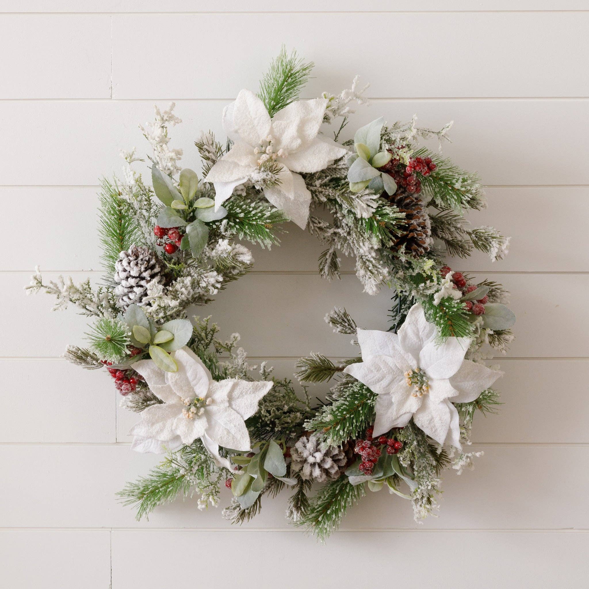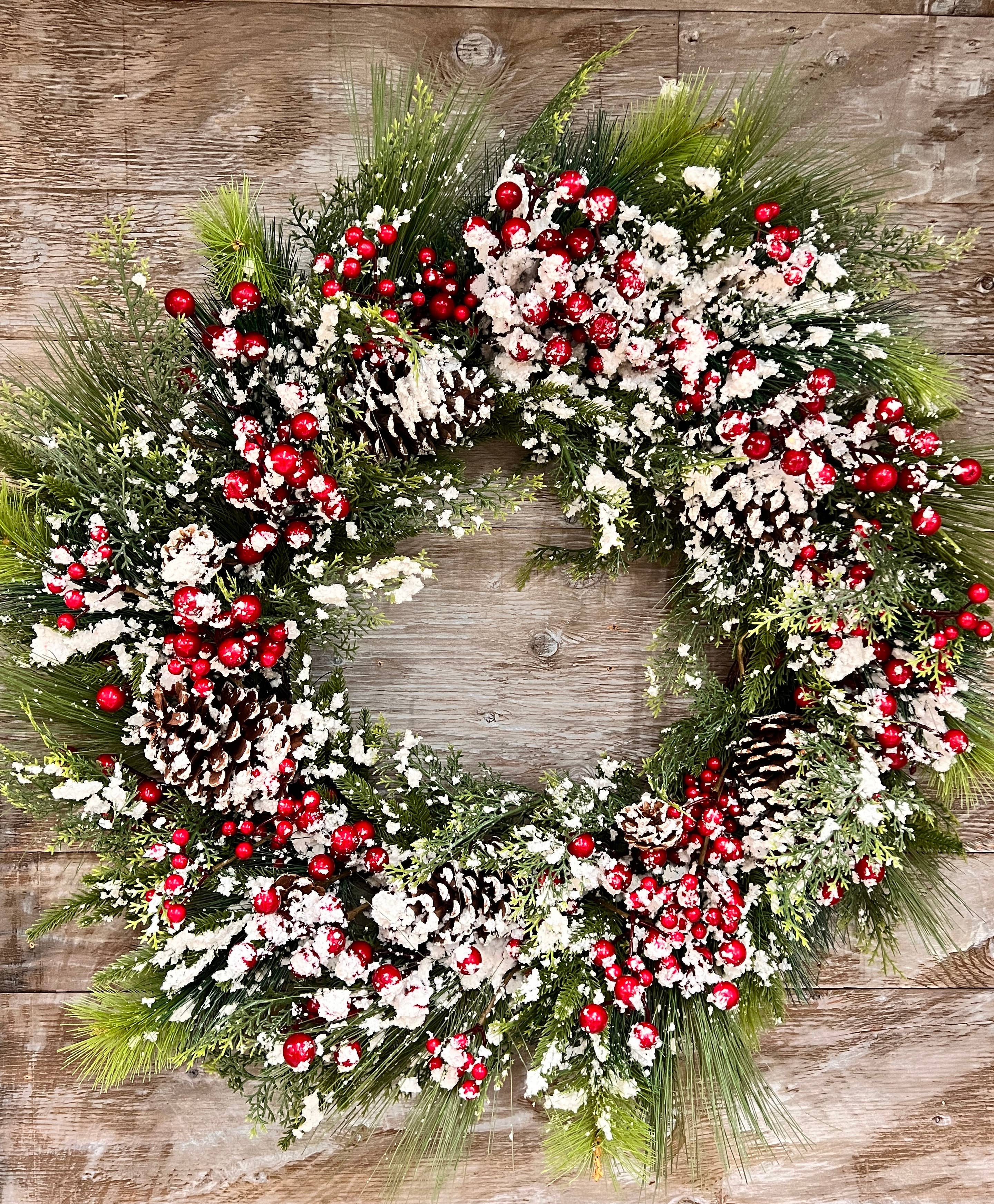 A winter white Canadian pine wreath will be a beautiful addition to your front door. This indoor/outdoor wreath is easy to hang and will look stunning decorated with tiny red berries and rustic pine cones. Metal hook for hanging (hardware not included). Unlit/Flame retardant. Suitable for indoor and outdoor use.