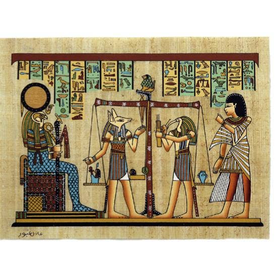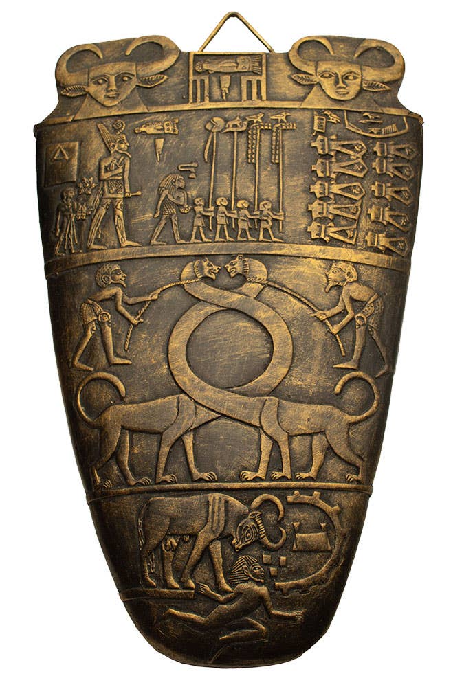 This plaque shows Anubis, the God of the Underworld, preparing a royal to bear gifts to Isis, the Mother Goddess of Healing and Magic. Material: Gypsum with triangle shaped hanger on back Width: 10 inches Height: 8.5 inches Depth: .25 inches Weight: 2 lbs Packaged with information card in a decorative hieroglyphic box Made in Egypt *Due to their handmade nature, items may exhibit slight variations in color and quality.*