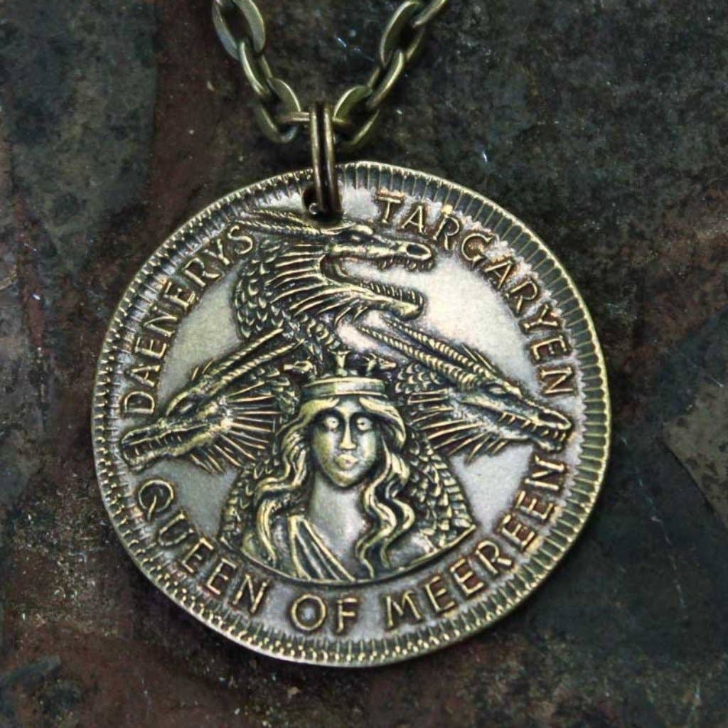 Valar Morghulis. All Men Must Die. This is the coin given to Arya Stark by the mysterious assassin Jaqen H'ghar. It is not a coin for buying things, but rather denotes association with the organization of the Faceless Men. The obverse of the coin depicts a hooded figure with an indistinct face. Depending on the light, he may seem to change in appearance. Inscriptions on reverse show our VDVM monogram in the center, surrounded by the words, Valar Morghulis, Valar Dohaeris: All men must die, all men must serve. This Valar Morghulis Necklace from the world of George R. R. Martin is struck from solid stainless steel, measures 2.7 cm in diameter, and weighs about 5 grams. Includes a 30" grey stainless steel cable chain with clasp. Coin artwork by Greg Franck-Weiby and Joe Paonessa. Officially licensed A Song of Ice and Fire merchandise © George R. R. Martin. All rights reserved. **SAMPLE COIN HAS HOLE**