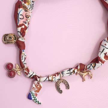 Chic and versatile, the Cabo Scarf Necklace is a unique blend of style and sophistication. This adjustable satin scarf necklace features an interchangeable 18k gold-plated charm, allowing you to customize your look effortlessly. Perfect for vacations, rooftop dinners, or adding a fashion-forward touch to any outfit.