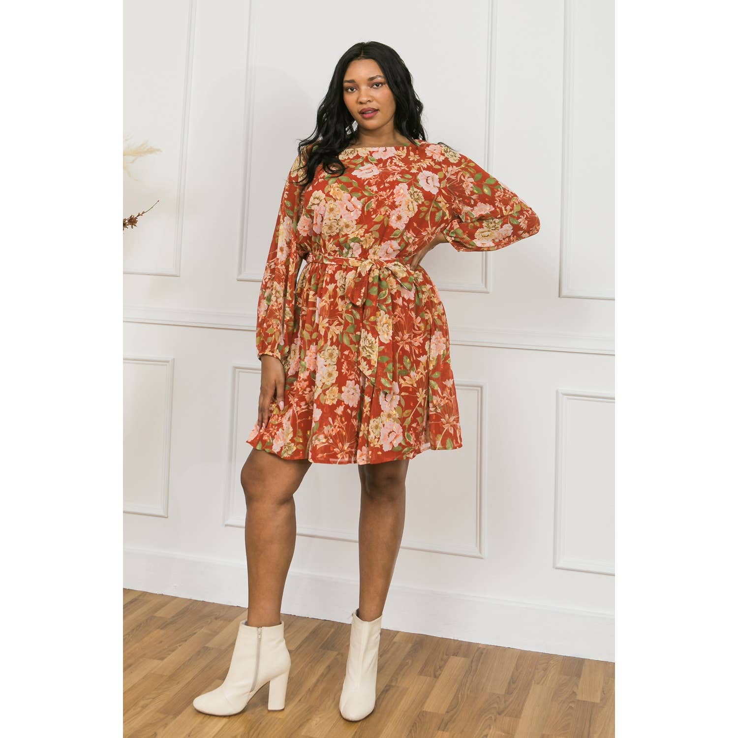 - This autumn-inspired mini dress features a rich floral print in warm shades of rust, crimson, and fuchsia. - Designed with a flattering A-line silhouette - Long puff sleeves with elastic cuffs, a delicate ruffled neckline, and button-front detailing for a feminine touch. - The removable self-tie belt cinches the waist, creating a defined shape while offering versatile styling. - Finished with a tiered skirt for added movement, this dress pairs effortlessly with ankle boots for a chic fall look. - Fall Dress / Fall Print Dress - Pocket STYLE# - LWD3273 * HPS - 34" SELF - 100% COTTON