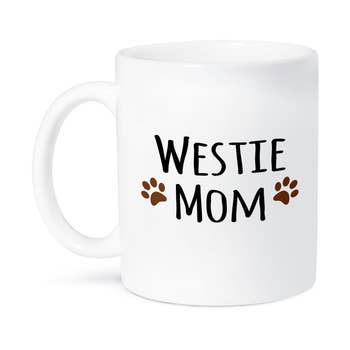 Westie Mom is printed on both sides of our premium quality 11 oz. white mug, scratch resistant. They are made of Ceramic, UV Protected, FDA Compliant, Microwave and Dishwasher Safe.