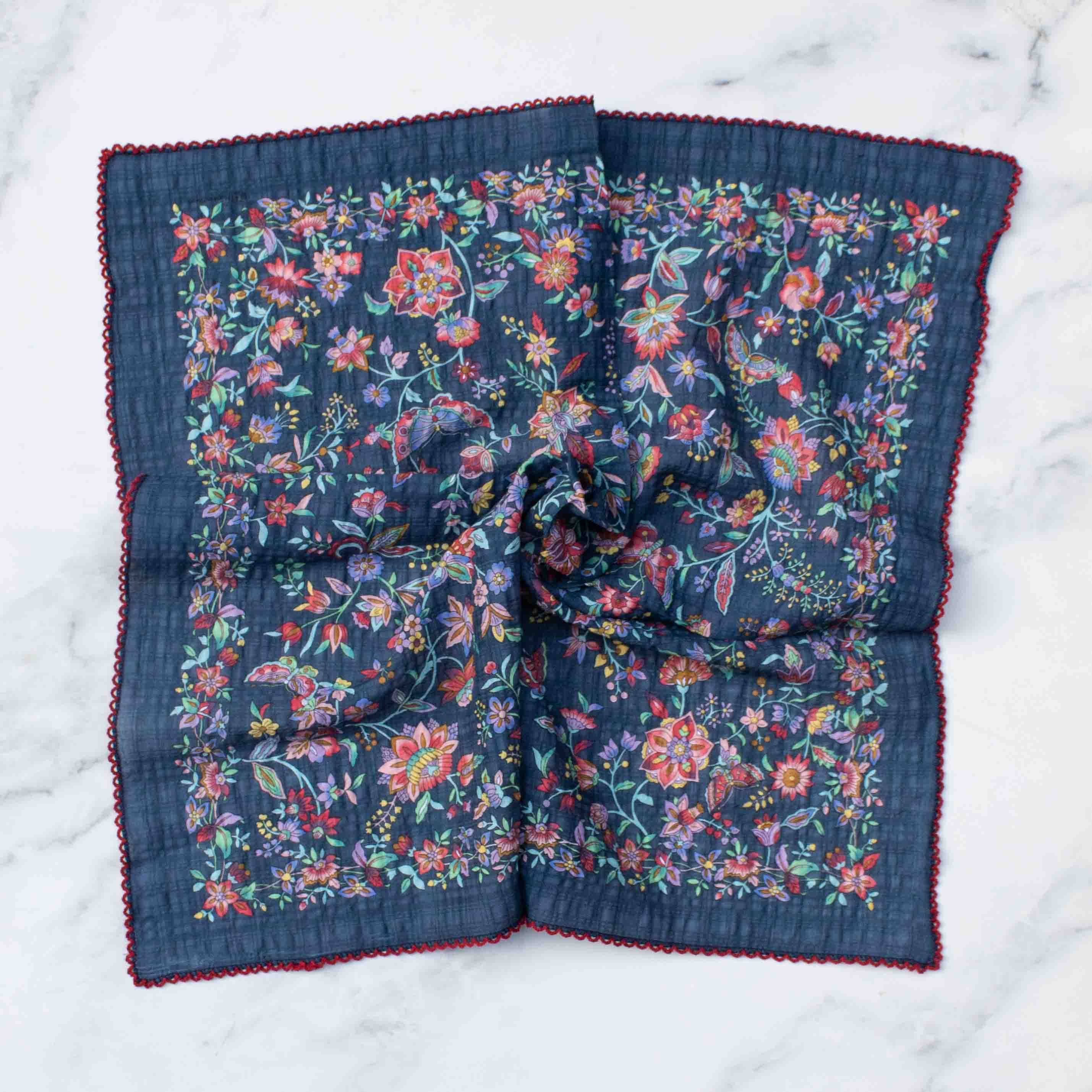 Set a new standard of style sophistication - it's the details that set you apart. Discover the transformative power of an Elizabetta neckerchief. This versatile wardrobe staple changes your style from classic elegance to modern suave, with a dash of charm or a bold, edgy twist. This floral pattern in shades of blue and pink with hand-rolled hems will give your look an elegant twist. This scarf is a testament to timeless craftsmanship, a blend of care, passion, and the beauty of handmade excellence. * Large bandana size: Approx. 27" x 27" (70 x 70cm), giving you more styling options than a typical small bandana. * Hand-rolled hems: For the ultimate in luxury and sophistication, the hems are hand-rolled and sewn.