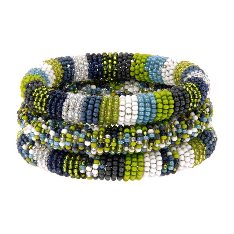 - PERFECT FOR YOUR GAME DAY NEEDS! - The Original Roll-On® Bracelet - Set of 12 bracelets; $6.50 per bracelet ($78 for the Set of 12) - Approximately 7” round - Ethically Crafted by our women artisans in Nepal - High quality glass beads and hand-dyed cotton thread - Expands over your hand to fit most wrists - Aid Through Trade is a Founding Member of the Fair Trade Federation and is the only authorized provider of Fair Trade Roll-On® Bracelets -Perfect for back to school + football season!