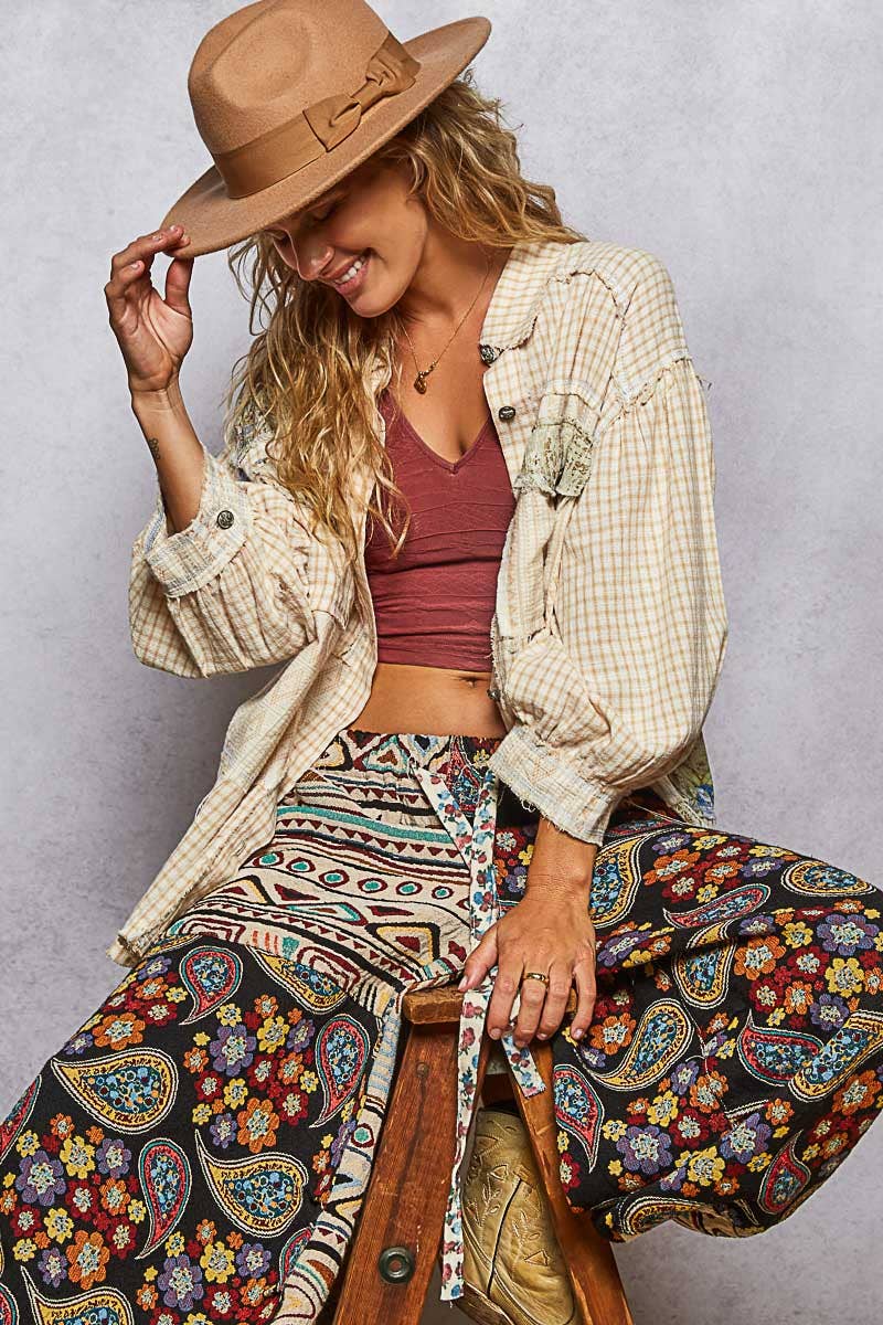Flannel with a story! Rich shades of red are pieced together like a handmade quilt, each piece stitched together with a bold zig zag stitch. Intentionally mismatched, every section creates a striking patchwork design that feels vintage, lived in, and full of soul. *ALL ITEMS ARE OVERSIZED AND NOT U.S. STANDARD SIZING - DUE TO THE VINTAGE SHABBY CHIC STYLE IN WHICH THEY ARE DESIGNED*