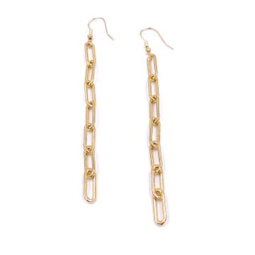 Detailed chain earrings for making a glittery statement. Available packaged on a card or in a jewelry bag. Display box provided with the purchase of 10 or more earring cards. Details: 14k gold filled. 1.5" drop. Hypoallergenic.