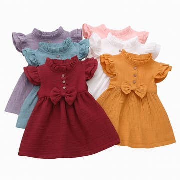 Wholesale Toddler Girl Solid Curved Hem Short-sleeve Belted Dress