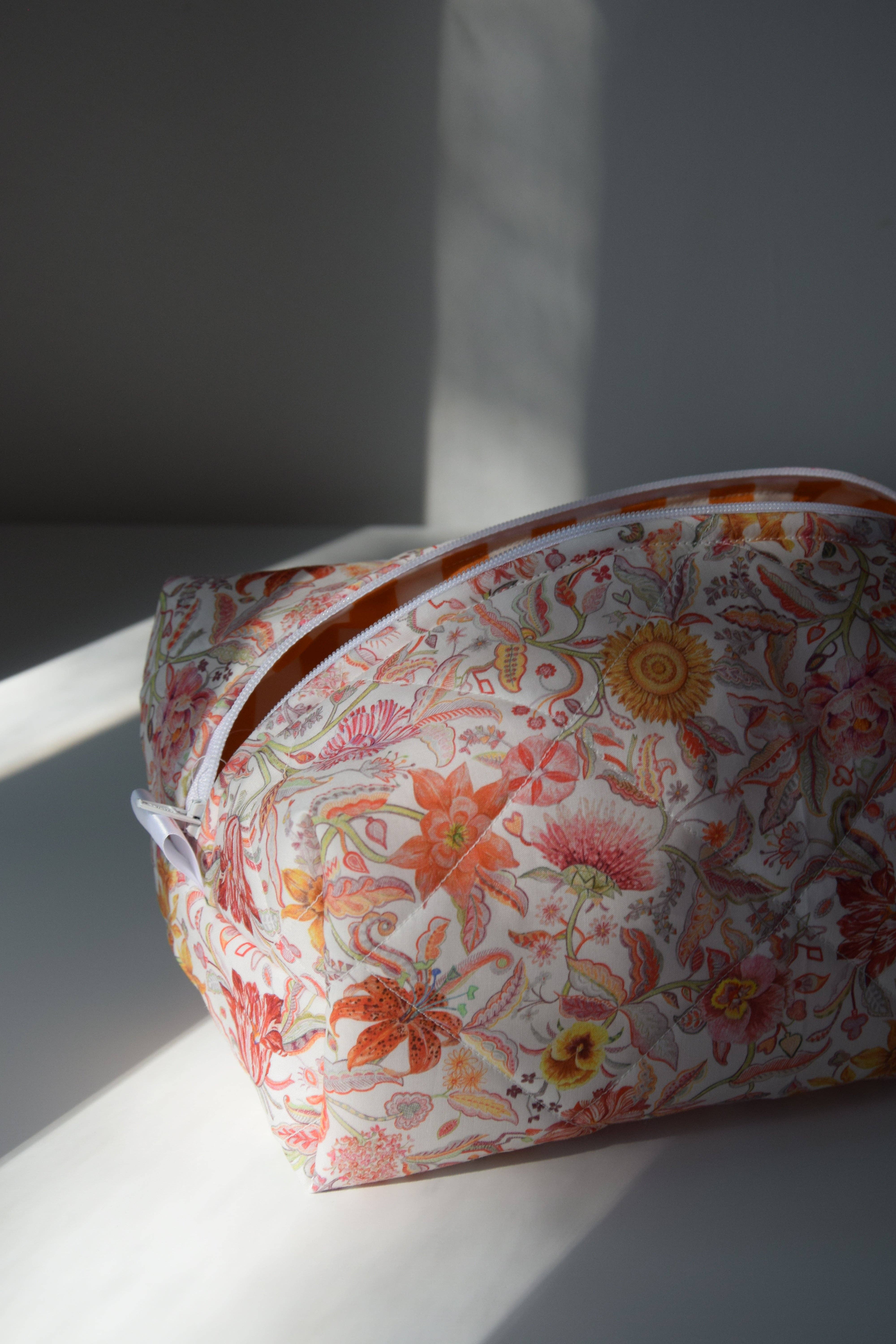 Sizing Mini: 2" x 5.5" x 1.5" Regular: 5.5" x 8.5" x 4" Add a touch of classic elegance to your daily essentials with The Morris cosmetic bag. Made from a beautiful William Morris fabric in deep navy, adorned with vibrant greens, soft blues, and sunny yellows, this bag is a true statement piece. The intricate bird design brings a timeless charm, while the bold red striped lining adds a pop of color on the inside. Spacious enough to hold all your beauty must-haves, The Morris features a sturdy zipper closure, keeping everything secure while maintaining a sleek, functional design. No pockets, just a simple, roomy interior perfect for your cosmetics, toiletries, or small accessories.