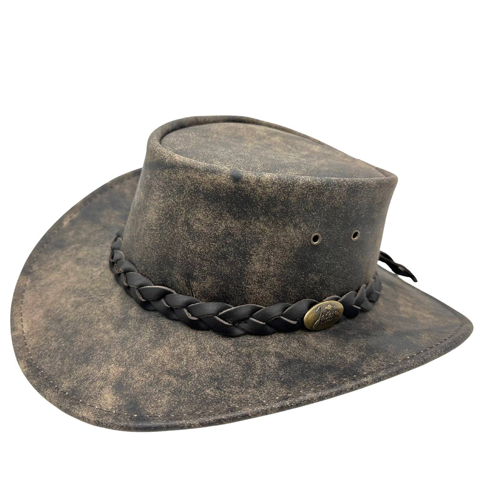 In need of a travel companion? The Jacaru 519 Roo Squashy hat is here for the adventure. A stylish two tone hat combining the popular stonewash kangaroo leather and a high quality cow leather. As the name suggests you can squash this hat in your luggage and its memory wire will bring back its form. Don't believe it? Try our guarantee - If our wire doesn't stand up to your travel needs we will replace it for the lifetime of the hat. * Kangaroo Leather (crown) * Bovine Leather (brim & top) * Crown height: 9cm * Brim width: 8cm * Crushable * comes with a handy travel bag * UPF 50+ * 10 Year Warranty * Made in Australia Please note that due to the nature of the stonewash, the Stonewash colour may vary between a lighter and darker brown.