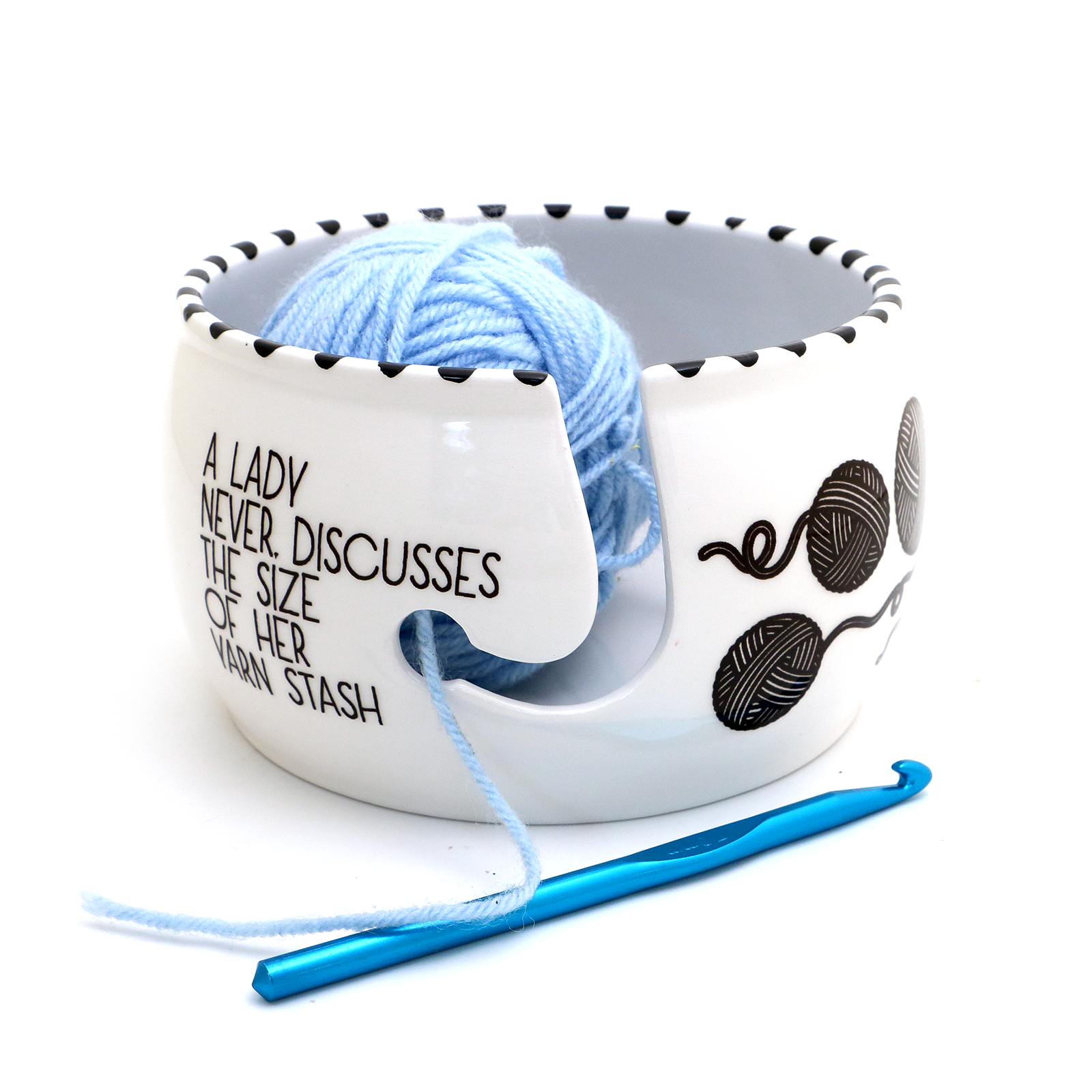 Handmade ceramic yarn bowl reads I Crochet so I Don't Choke People, Save a life...send yarn. Funny gift for someone who crochets - like giving them anger management classes in a warm and fuzzy way! Created from stoneware clay, kiln fired twice to over 1900 degrees. Interior is black. This large yarn bowl measures 6.25 inches wide and 3.5 inches high and features a wool release hook.