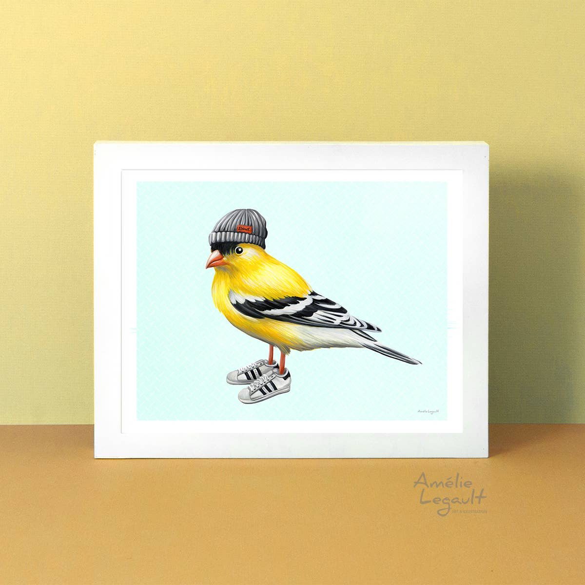 This chickadee bird is very stylish with his jean hat and sneaker shoes! Fun artwork for bird lovers! 8'' x 10''. (20.3 x 25.4 cm). Gallery quality print from an original gouache painting. Printed on archival matte paper (192g/m2). Carefully packaged in a cello sleeve with a white backing board behind. Signed. Frame not included.