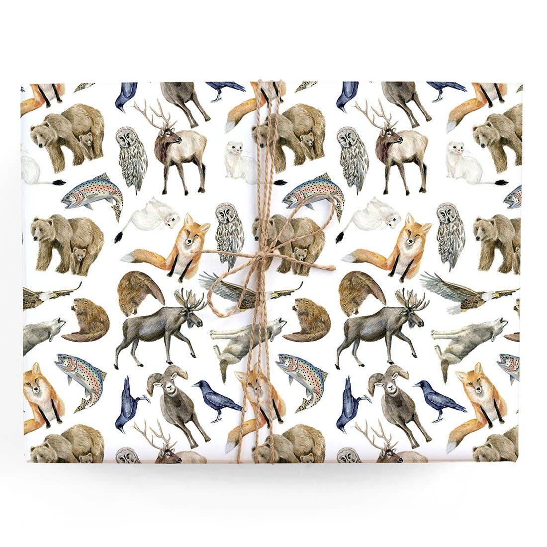 Single gift wrap sheet. Each sheet measures 19" x 29". 70lb uncoated paper. This wrapping paper features minimalist forest animals against a light green background. With a cool and natural vibe, It's a great Christmas wrapping paper, but it’s also a versatile choice for all occasions throughout the year from the winter holidays to everyday celebrations. This gift wrap is illustrated, printed, and packaged with love in Denver, Colorado.
