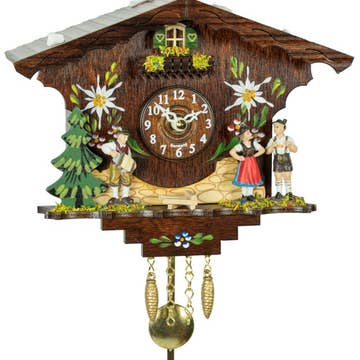 Adorable bears adorn this chalet style cuckoo clock making this model the nature lovers dream. The quartz movement plays melodies accompanied by the cuckoo call each hour. Made in Germany 12 Melodies and Cuckoo Call on the Hour Requires 3 C Batteries 9.5" x 9.5" x 6.5"