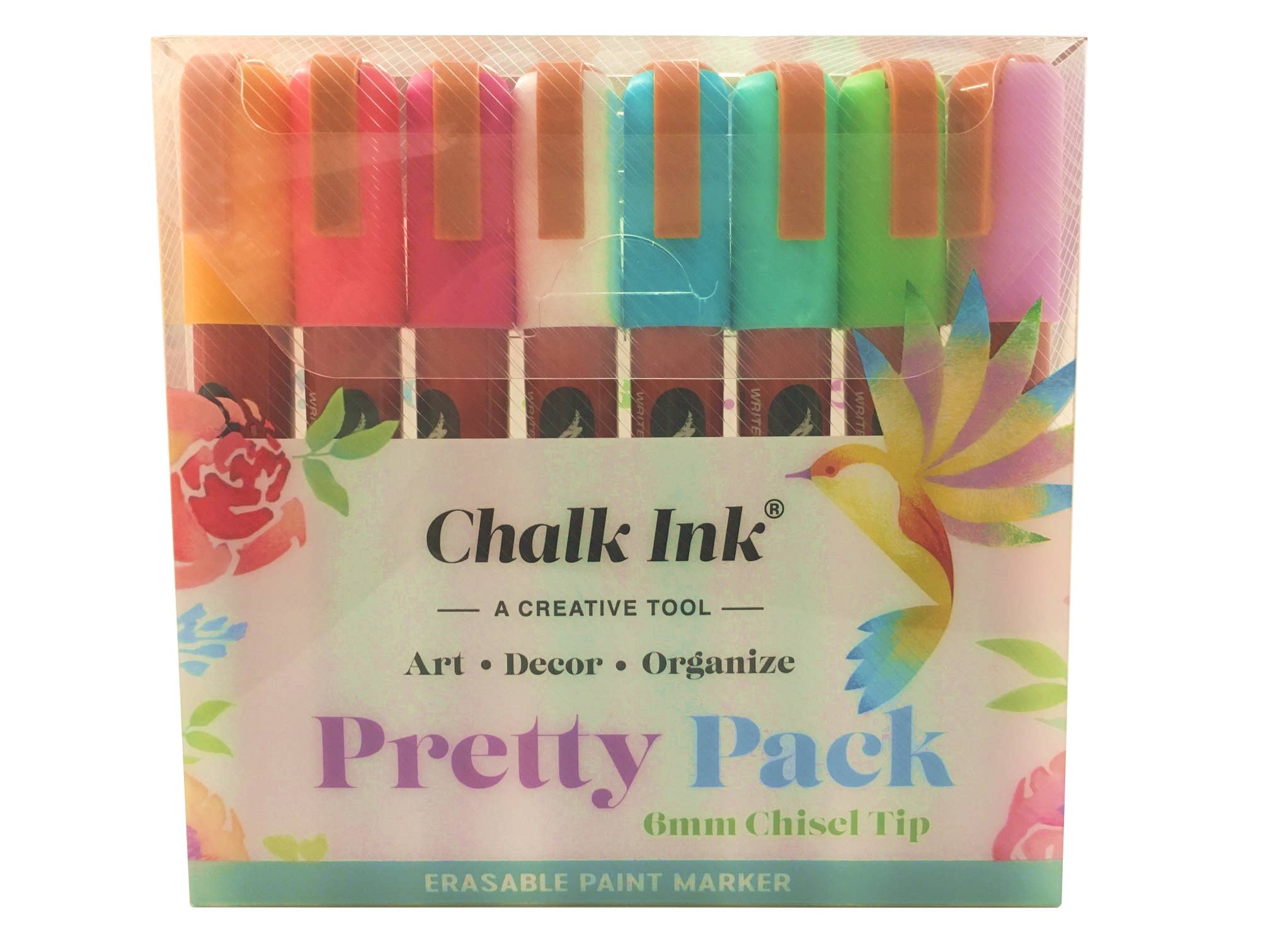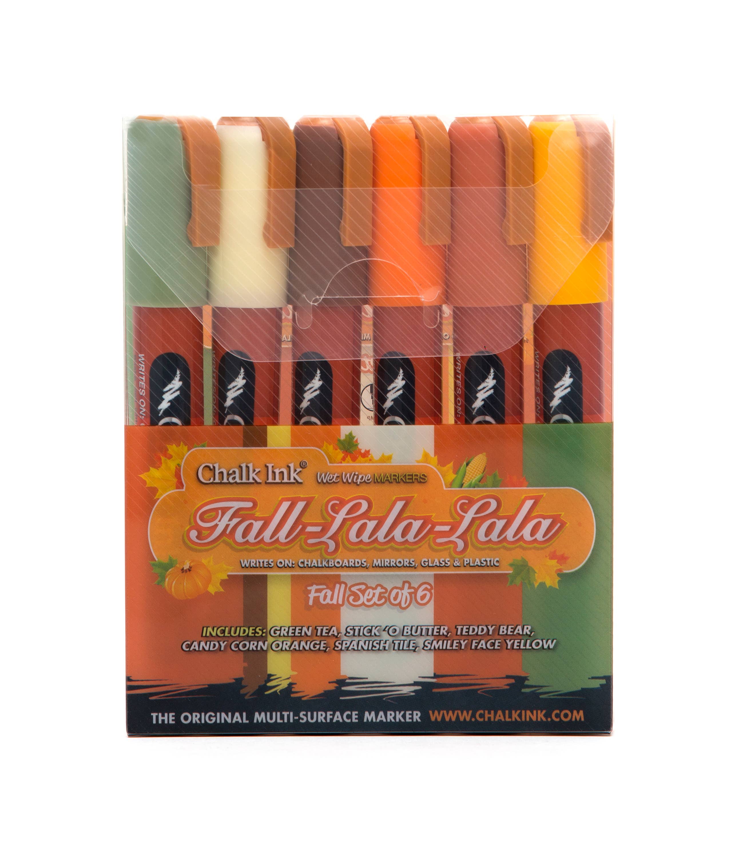 6mm Wet Wipe Classic 6 Pack includes Chalk White, Clown Nose Red, Pacific Blue, Astroturf Green, Smiley Face Yellow, and Candy Corn Orange. 6mm chisel tip is great for lettering and creating clean, crisp lines. Chalk Ink® Wet Wipe Markers write like a paint pen but dry to look just like chalk without the dusty mess traditional chalk can leave behind. Quick drying and smear-proof once dry; you can easily layer with other colored Chalk Ink® markers to create whatever designs you can imagine. 6mm chisel tip can be pulled out and flipped to a bullet tip for even more drawing and lettering effects. Safe for use on a variety of non-porous surfaces, including chalkboards, Chalk Ink® Chalkboard Paint, glass, mirrors, windows, metal, and plastic. To clean, simply wipe away with a cloth and a little bit of water.